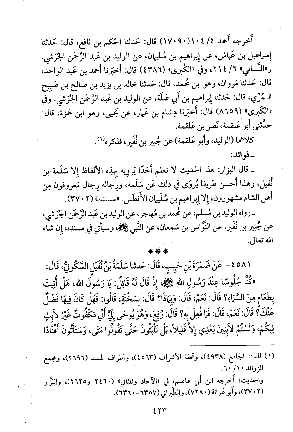 - رواه الوليد بن مسلم، عن محمد بن مهاجر، عن الوليد بن عبد الرَّحمَن الجرشي، عن جُبير بن نُفير، عن النواس بن سمعان، عن النبي صَلى الله عَليه وسَلم ويأتي في مسنده برقم ().