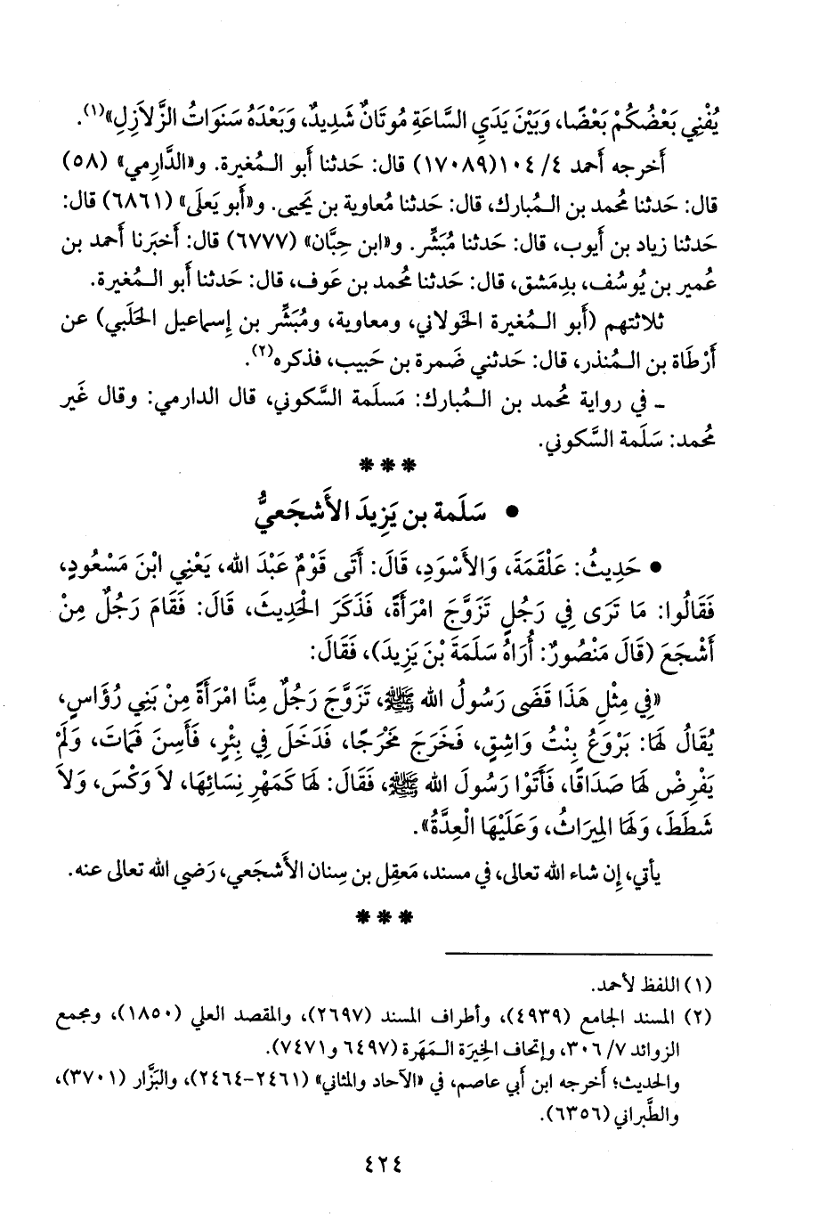- حديث: علقمة، والأسود، قال: أتى قوم عبد الله، يعني ابن مسعود، فقالوا: ما ترى في رجل تزوج امرأة، فذكر الحديث، قال: فقام رجل من أشجع (قال منصور: أراه سلمة بن يزيد)، فقال: