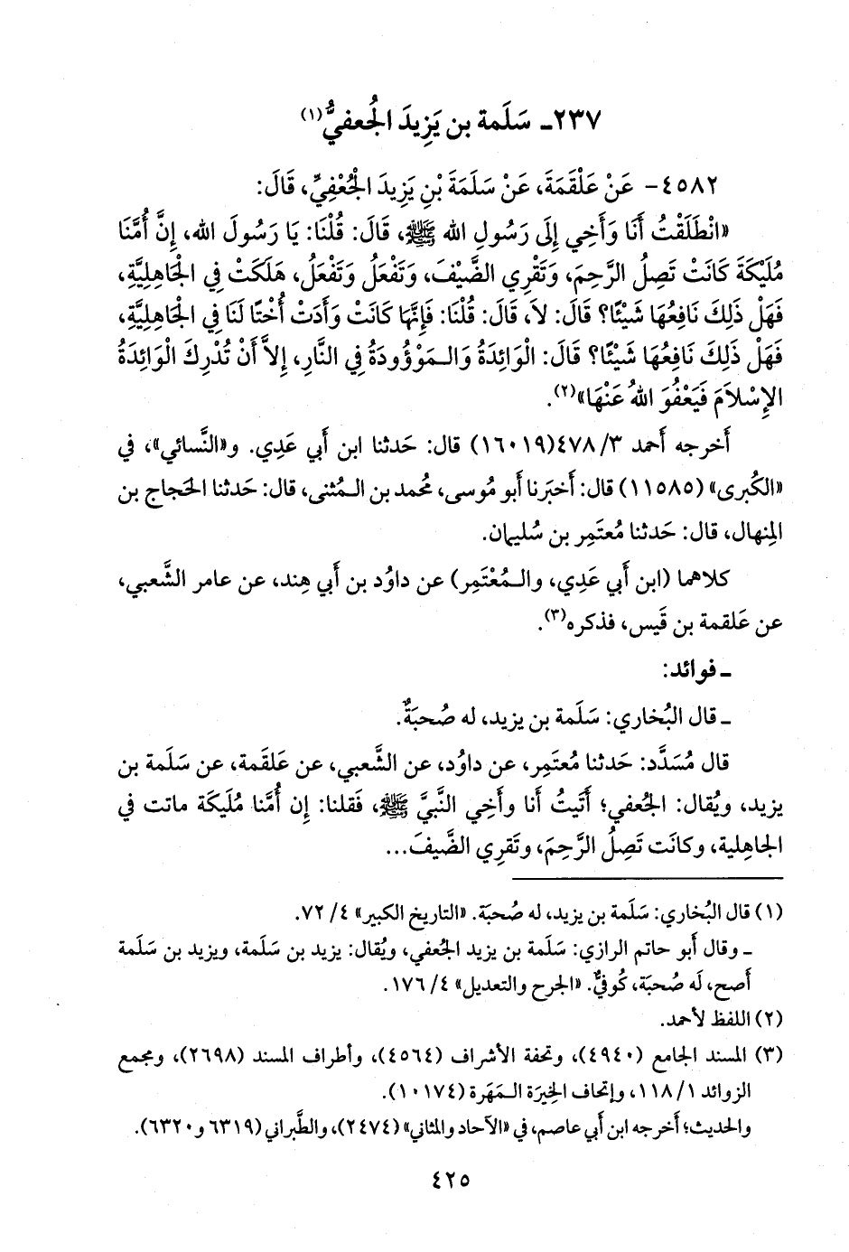 قال مُسدد: حدثنا معتمر، عن داود، عن الشعبي، عن علقمة، عن سلمة بن يزيد، ويقال: الجعفي؛ أتيت أنا وأخي النبي صَلى الله عَليه وسَلم فقلنا: إن أمنا مليكة ماتت في الجاهلية، وكانت تصل الرحم، وتقري الضيف ..