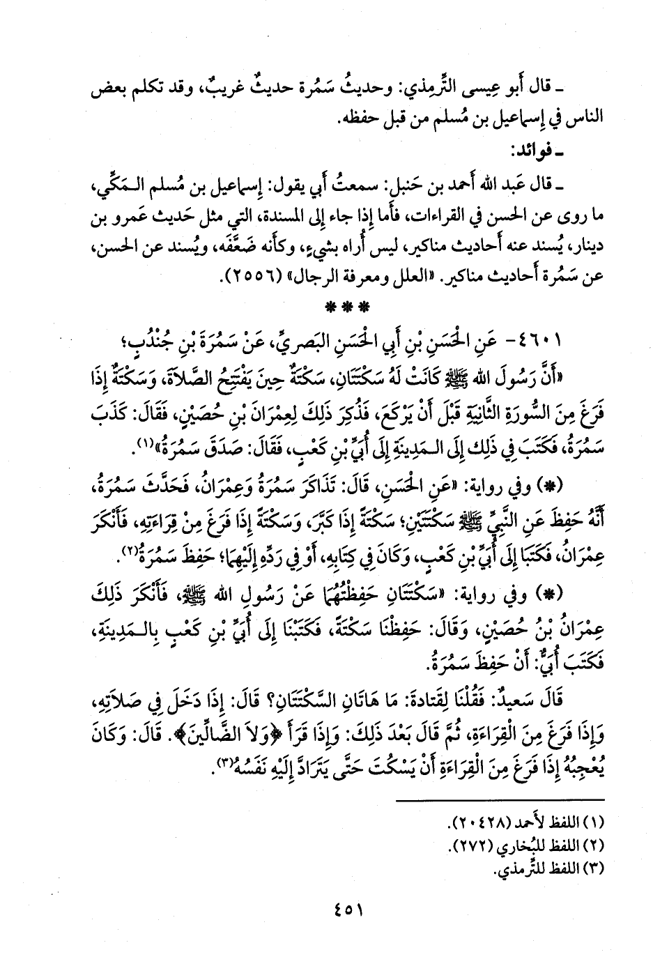 - وفي رواية: «سكتتان حفظتهما عن رسول الله صَلى الله عَليه وسَلم فأنكر ذلك عمران بن حصين، وقال: حفظنا سكتة، فكتبنا إلى أُبي بن كعب بالمدينة، فكتب أبي: أن حفظ سمرة.