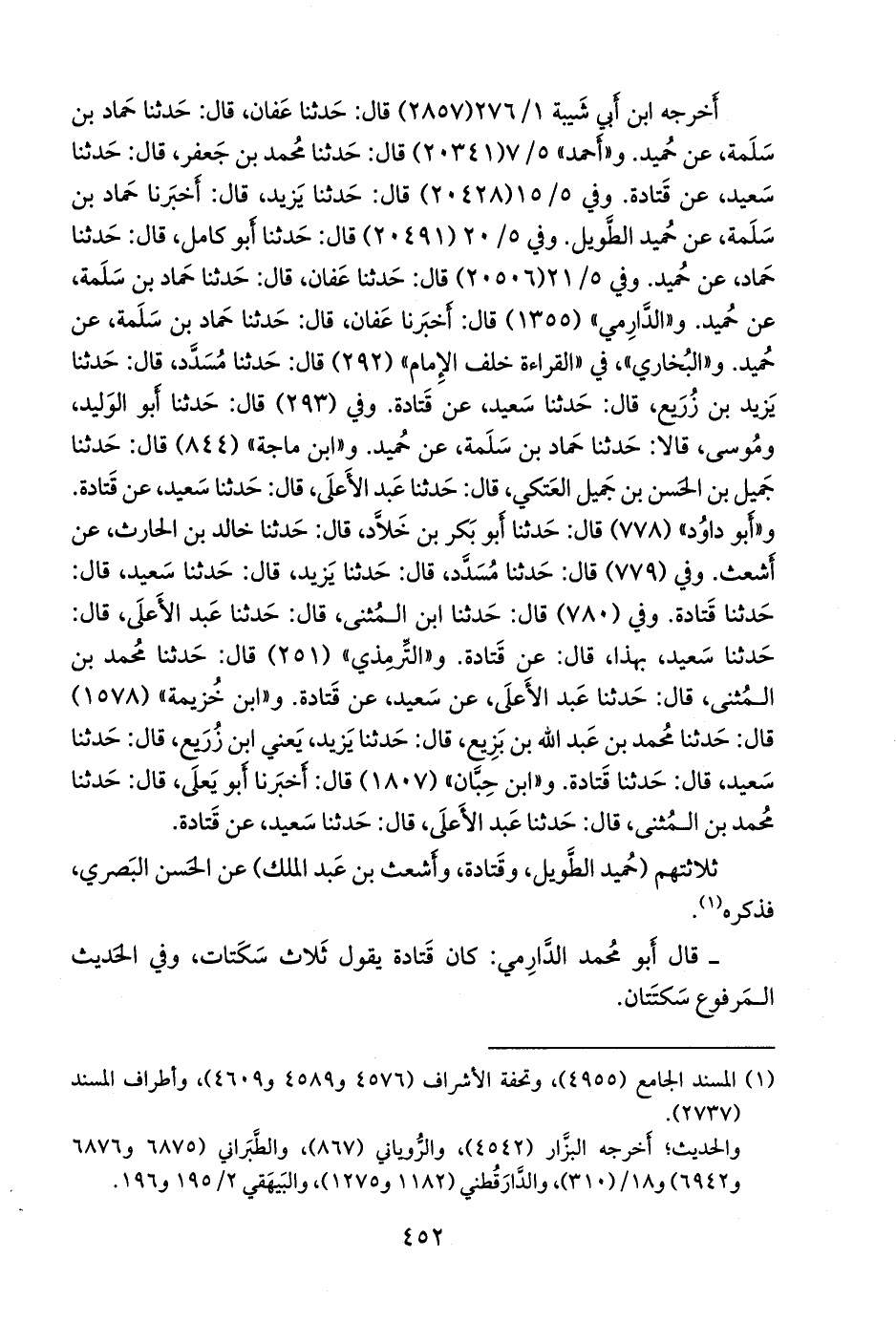 وفي (٢٩٣) قال: حدثنا أَبو الوليد، وموسى، قالا: حدثنا حماد بن سلمة، عن حميد. و «ابن ماجة» (٨٤٤) قال: حدثنا جميل بن الحسن بن جميل العتكي، قال: حدثنا عبد الأعلى، قال: حدثنا سعيد، عن قتادة. و «أَبو داود» (٧٧٨) قال: حدثنا أَبو بكر بن خلاد، قال: حدثنا خالد بن الحارث، عن أشعث. وفي (٧٧٩) قال: حدثنا مُسدد، قال: حدثنا يزيد، قال: حدثنا سعيد، قال: حدثنا قتادة. وفي (٧٨٠) قال: حدثنا ابن المثنى، قال: حدثنا عبد الأعلى، قال: حدثنا سعيد، بهذا، قال: عن قتادة. و «التِّرمِذي» (٢٥١) قال: حدثنا محمد بن المثنى، قال: حدثنا عبد الأعلى، عن سعيد، عن قتادة. و «ابن خزيمة» (١٥٧٨) قال: حدثنا محمد بن عبد الله بن بزيع، قال: حدثنا يزيد، يعني ابن زُريع، قال: حدثنا سعيد، قال: حدثنا قتادة. و «ابن حِبَّان» (١٨٠٧) قال: أخبرنا أَبو يَعلى، قال: حدثنا محمد بن المثنى، قال: حدثنا عبد الأعلى، قال: حدثنا سعيد، عن قتادة.