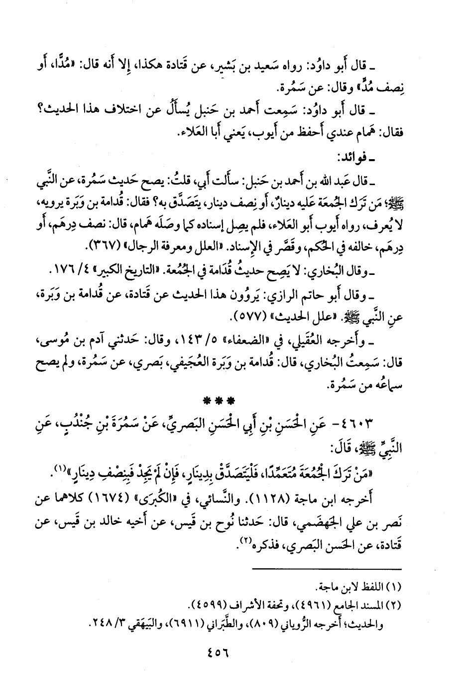 - قلنا: إسناده ضعيفٌ؛ قال عبد الله بن أحمد بن حنبل: سألت أبي، قلت: يصح حديث سمرة، عن النبي صَلى الله عَليه وسَلم؛ من ترك الجمعة عليه دينار، أو نصف دينار، يتصدق به؟ فقال: قدامة بن وبرة يرويه، لا يعرف، رواه أيوب أَبو العلاء، فلم يصل إسناده كما وصله همام، قال: نصف درهم، أو درهم، خالفه في الحكم، وقصر في الإسناد. «العلل ومعرفة الرجال» (٣٦٧).