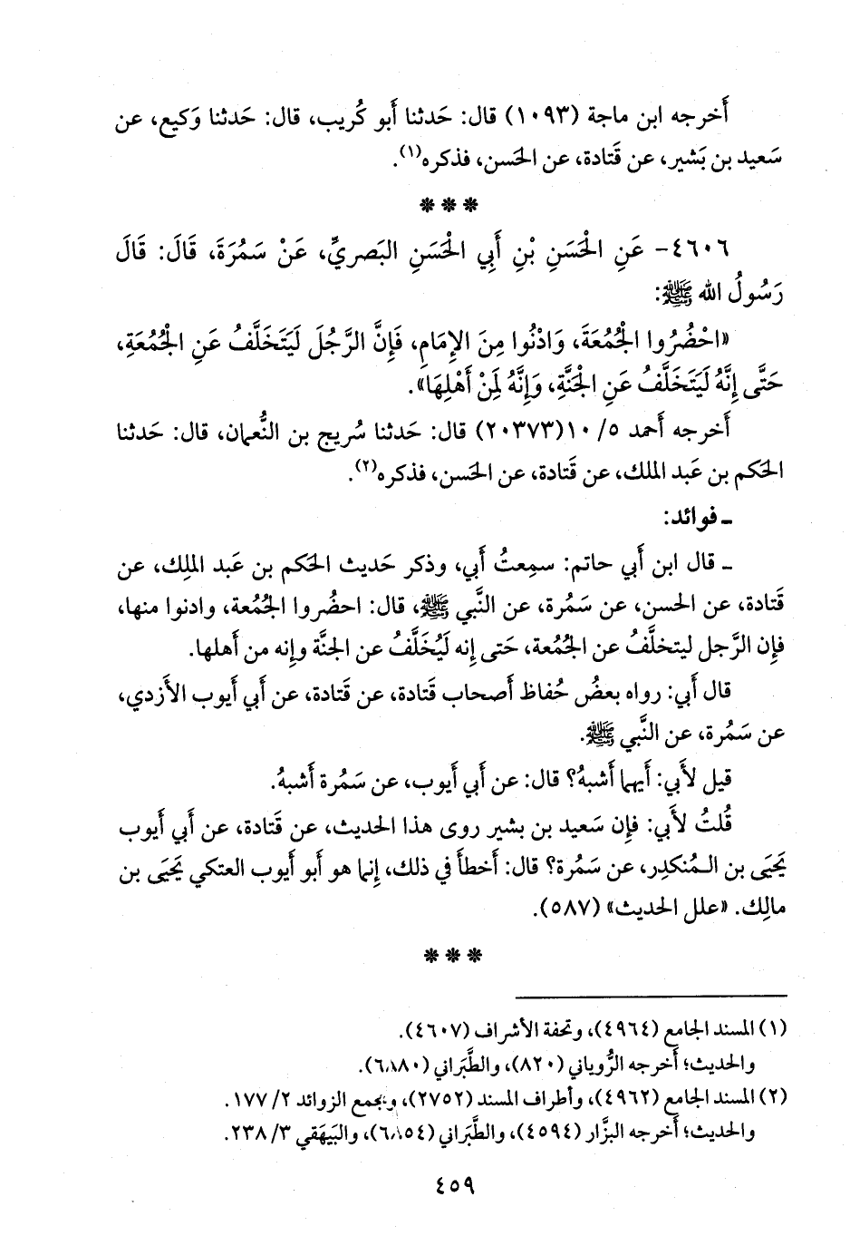 - وقال ابن أبي حاتم: سمعت أبي، وذكر حديث الحكم بن عبد الملك، عن قتادة، عن الحسن، عن سمرة، عن النبي صَلى الله عَليه وسَلم قال: احضروا الجمعة، وادنوا منها، فإن الرجل ليتخلف عن الجمعة، حتى إنه ليخلف عن الجنة وإنه من أهلها.