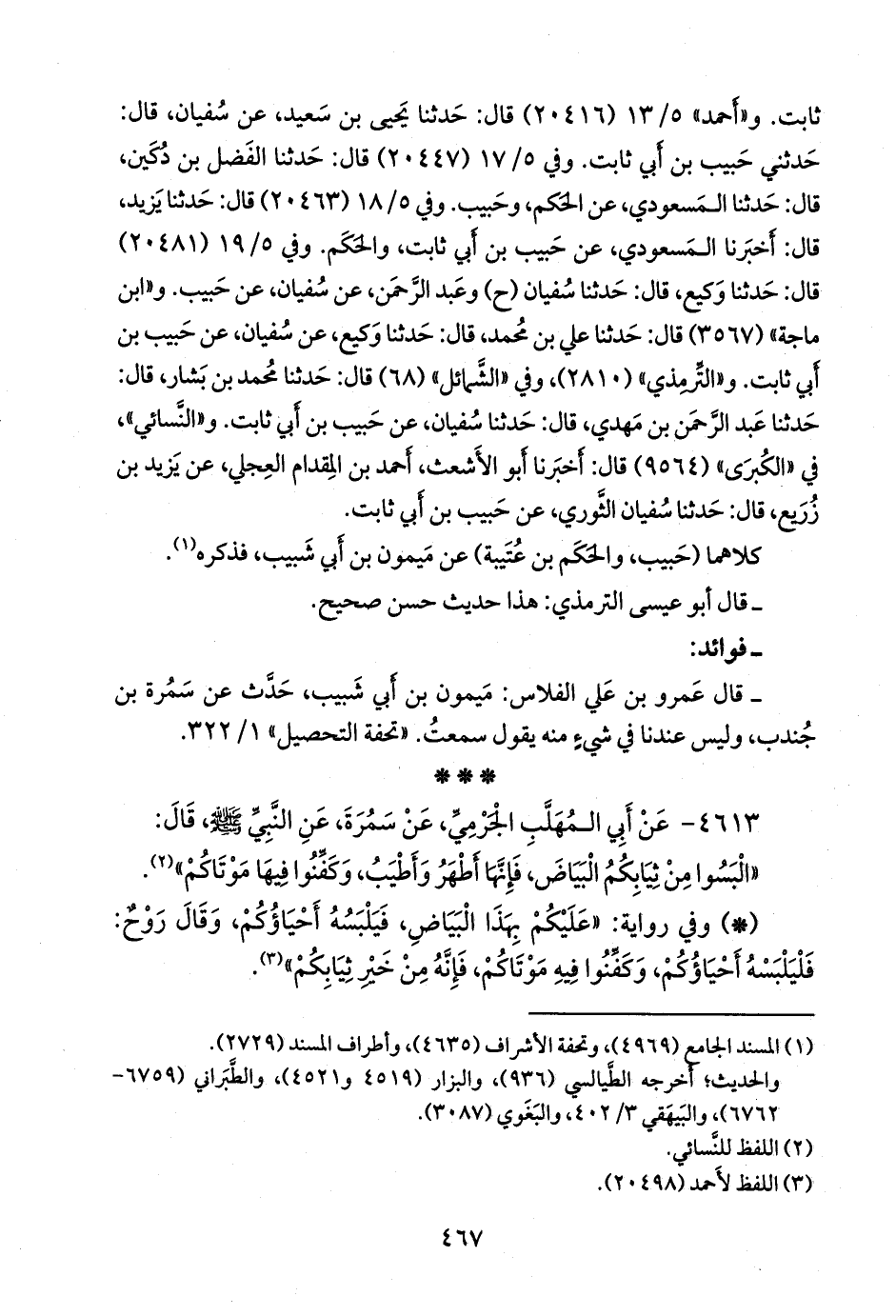 وفي ٥/ ١٩ (٢٠٤٨١) قال: حدثنا وكيع، قال: حدثنا سفيان (ح) وعبد الرَّحمَن، عن سفيان، عن حبيب. و «ابن ماجة» (٣٥٦٧) قال: حدثنا علي بن محمد، قال: حدثنا وكيع، عن سفيان، عن حبيب بن أبي ثابت. و «التِّرمِذي» (٢٨١٠)، وفي «الشمائل» (٦٨) قال: حدثنا محمد بن بشار، قال: حدثنا عبد الرَّحمَن بن مهدي، قال: حدثنا سفيان، عن حبيب بن أبي ثابت. و «النَّسَائي» في «الكبرى» (٩٥٦٤) قال: أخبرنا أَبو الأشعث، أحمد بن المقدام العجلي، عن يزيد بن زُريع، قال: حدثنا سفيان الثوري، عن حبيب بن أبي ثابت.