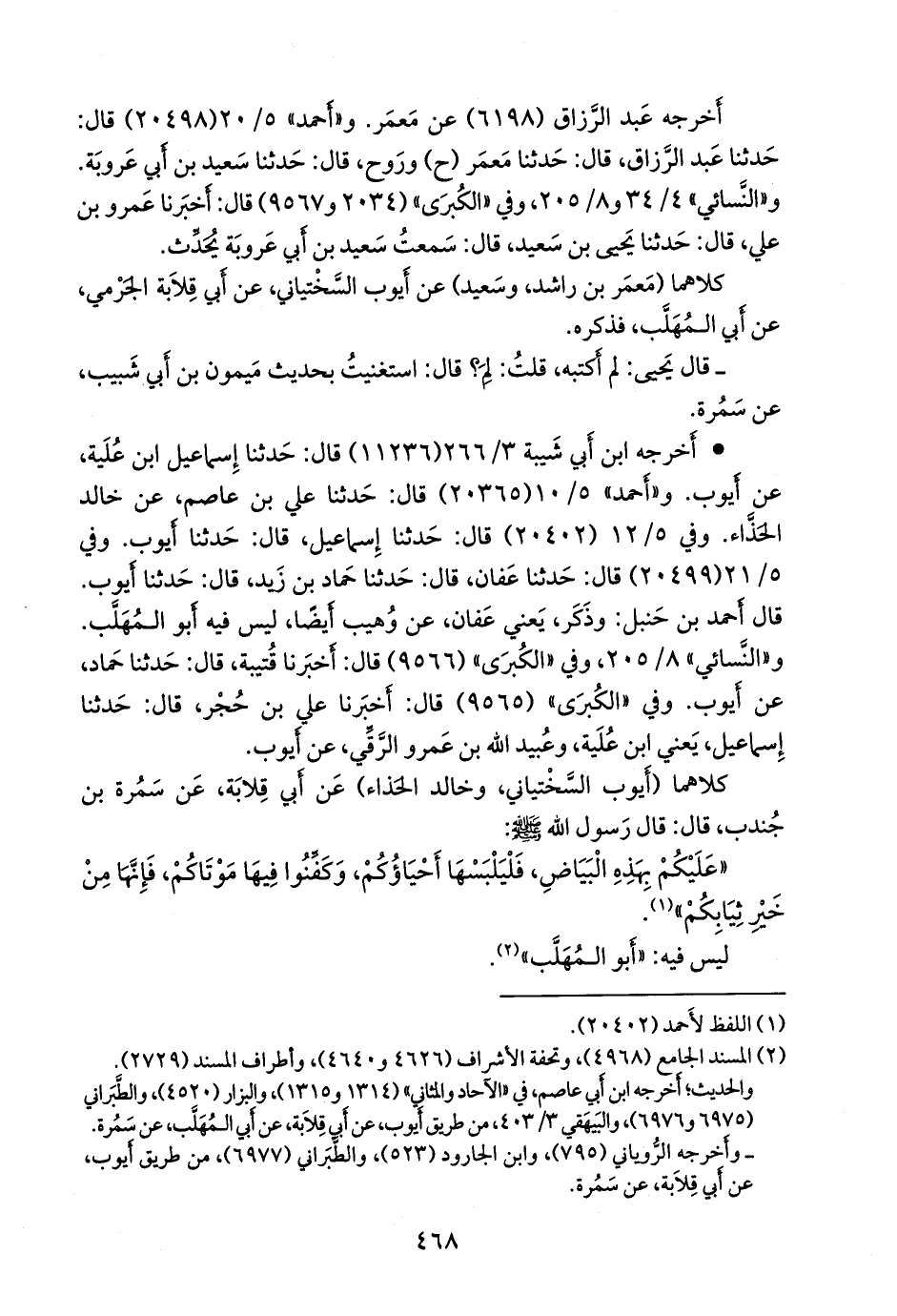 وفي ٥/ ١٢ (٢٠٤٠٢) قال: حدثنا إسماعيل، قال: حدثنا أيوب. وفي ٥/ ٢١ (٢٠٤٩٩) قال: حدثنا عفان، قال: حدثنا حماد بن زيد، قال: حدثنا أيوب. قال أحمد بن حنبل: وذكر، يعني عفان، عن وهيب أيضا، ليس فيه أَبو المهلب. و «النَّسَائي» ٨/ ٢٠٥، وفي «الكبرى» (٩٥٦٦) قال: أخبرنا قتيبة، قال: حدثنا حماد، عن أيوب. وفي «الكبرى» (٩٥٦٥) قال: أخبرنا علي بن حُجْر، قال: حدثنا إسماعيل، يعني ابن عُلَية، وعُبيد الله بن عَمرو الرَّقِّي، عن أيوب.