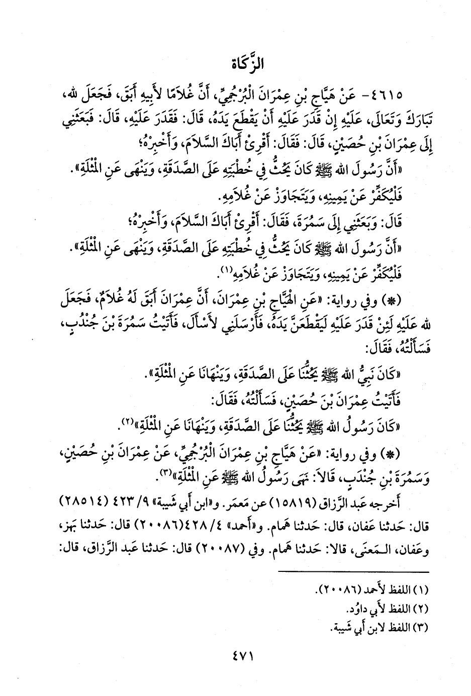 - وفي رواية: «عن هياج بن عمران البرجمي، عن عمران بن حصين، وسمرة بن جُندب، قالا: نهى رسول الله صَلى الله عَليه وسَلم عن المثلة» (¬٣).