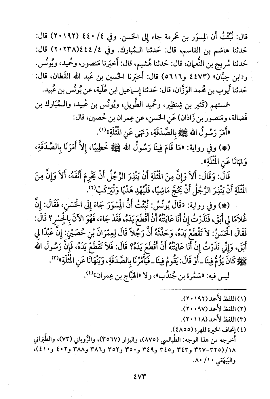 - وفي رواية: «قال يونس: نبئت أن المسور جاء إلى الحسن، فقال: إن غلاما لي أبق، فنذرت إن أنا عاينته أن أقطع يده، فقد جاء، فهو الآن بالجسر؟ قال: فقال الحسن: لا تقطع يده، وحدثه أن رجلا قال لعمران بن حصين: إن عبدًا لي أبق، وإني نذرت إن أنا عاينته أن أقطع يده؟ قال: فلا تقطع يده، فإن رسول الله صَلى الله عَليه وسَلم كان يؤم فينا، أو قال: يقوم فينا ـ فيأمرنا بالصدقة، وينهانا عن المثلة» (¬١).
