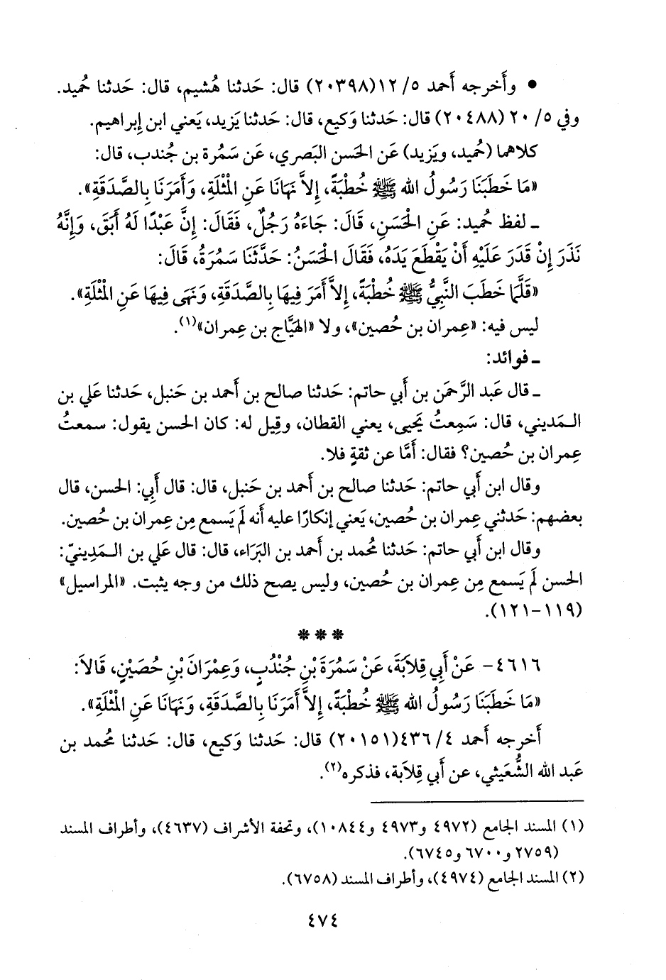 - قلنا: إِسناده ضعيفٌ؛ قال عبد الرَّحمَن بن أبي حاتم: حدثنا صالح بن أحمد بن حنبل، قال: حدثنا علي بن المديني، قال: سمعت يحيى، يعني القطان، وقيل له: كان الحسن يقول: سمعت عمران بن حصين؟ فقال: أما عن ثقة فلا.