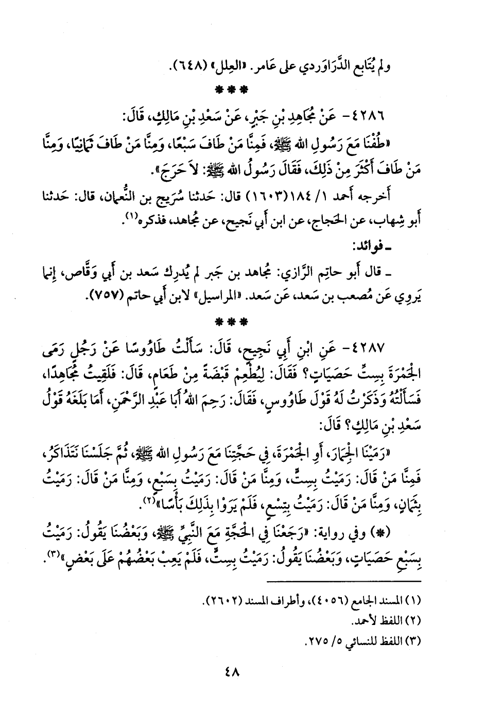 ٤٢٨٧ - عن ابن أَبي نَجيح، قال: سألت طاووسا عن رجل رمى الجمرة بست حصيات؟ فقال: ليطعم قبضة من طعام، قال: فلقيت مجاهدا، فسألته وذكرت له قول طاووس، فقال: رحم الله أبا عبد الرَّحمَن، أما بلغه قول سعد بن مالك؟ قال: