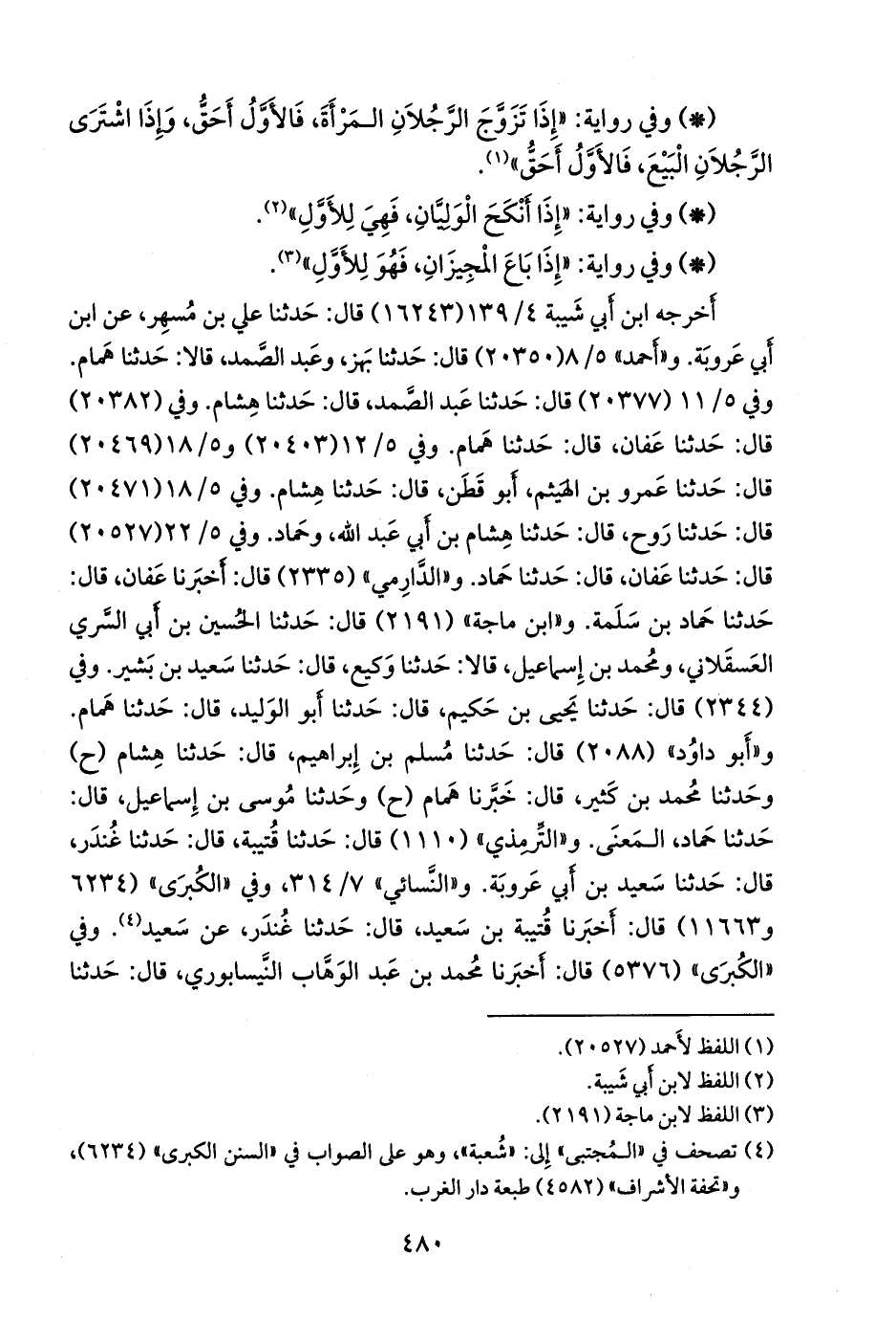 وفي ٥/ ١٨ (٢٠٤٧١) قال: حدثنا روح، قال: حدثنا هشام بن أبي عبد الله، وحماد. وفي ٥/ ٢٢ (٢٠٥٢٧) قال: حدثنا عفان، قال: حدثنا حماد. و «الدَّارِمي» (٢٣٣٥) قال: أخبرنا عفان، قال: حدثنا حماد بن سلمة. و «ابن ماجة» (٢١٩١) قال: حدثنا الحسين بن أبي السري العسقلاني، ومحمد بن إسماعيل، قالا: حدثنا وكيع، قال: حدثنا سعيد بن بشير. وفي (٢٣٤٤) قال: حدثنا يحيى بن حكيم، قال: حدثنا أَبو الوليد، قال: حدثنا همام. و «أَبو داود» (٢٠٨٨) قال: حدثنا مسلم بن إبراهيم، قال: حدثنا هشام (ح) وحدثنا محمد بن كثير، قال: خبرنا همام (ح) وحدثنا موسى بن إسماعيل، قال: حدثنا حماد، المعنى. و «التِّرمِذي» (١١١٠) قال: حدثنا قتيبة، قال: حدثنا غُندَر، قال: حدثنا سعيد بن أبي عَروبَة. و «النَّسَائي» ٧/ ٣١٤، وفي «الكبرى» (٦٢٣٤ و ١١٦٦٣) قال: أخبرنا قتيبة بن سعيد، قال: حدثنا غُندَر، عن سعيد (¬١). وفي «الكبرى» (٥٣٧٦) قال: أخبرنا محمد بن عبد الوَهَّاب النيسابوري، قال: حدثنا