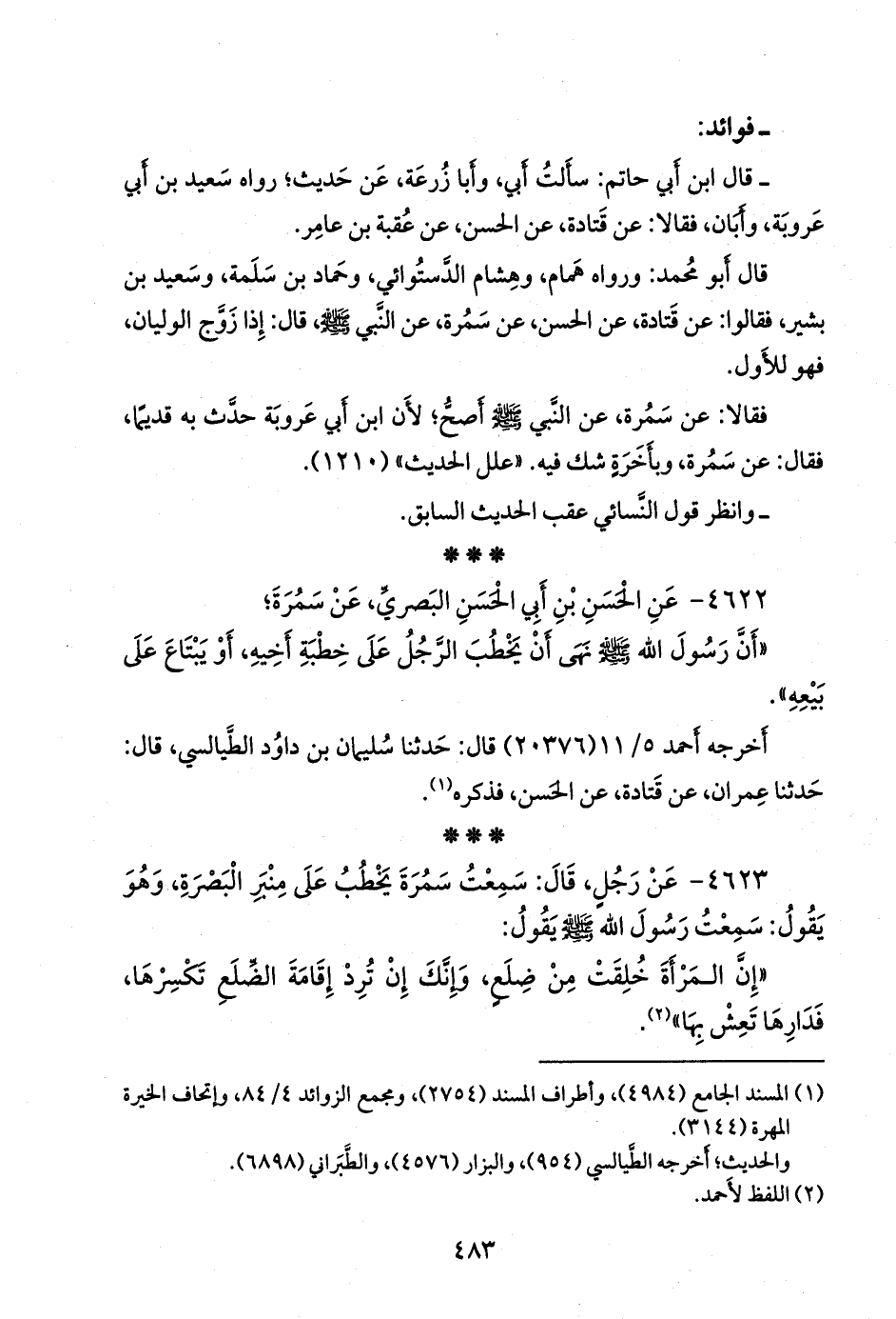 قال أَبو محمد: ورواه همام، وهشام الدَّستوائي، وحماد بن سلمة، وسعيد بن بشير، فقالوا: عن قتادة، عن الحسن، عن سمرة، عن النبي صَلى الله عَليه وسَلم قال: إذا زوج الوليان، فهو للأول.