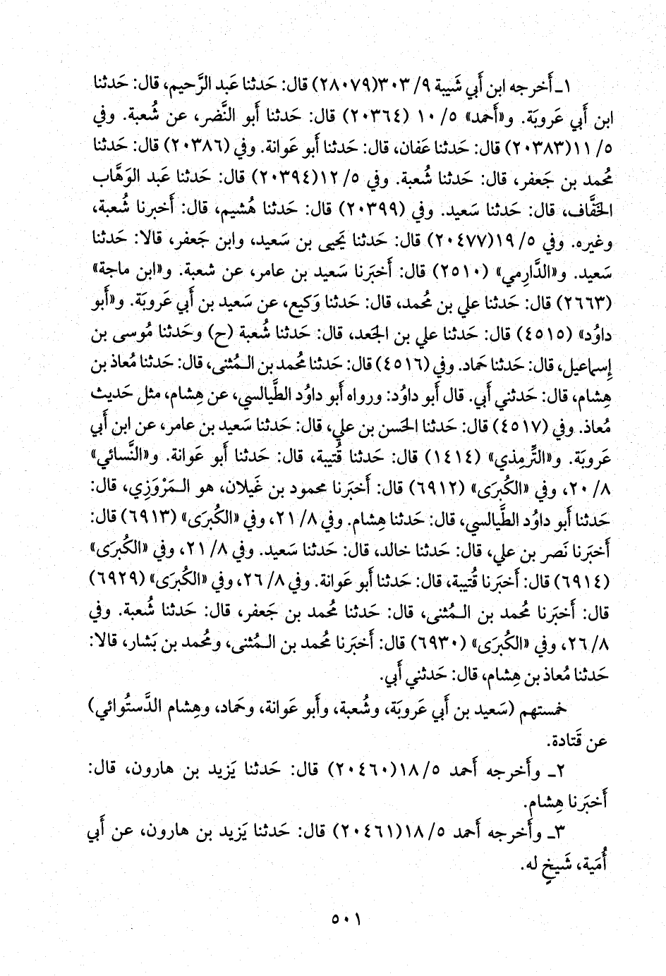 وفي (٤٥١٦) قال: حدثنا محمد بن المثنى، قال: حدثنا معاذ بن هشام، قال: حدثني أبي. قال أَبو داود: ورواه أَبو داود الطيالسي، عن هشام، مثل حديث معاذ. وفي (٤٥١٧) قال: حدثنا الحسن بن علي، قال: حدثنا سعيد بن عامر، عن ابن أبي عَروبَة. و «التِّرمِذي» (١٤١٤) قال: حدثنا قتيبة، قال: حدثنا أَبو عَوانة. و «النَّسَائي» ٨/ ٢٠، وفي «الكبرى» (٦٩١٢) قال: أخبرنا محمود بن غَيلان، هو المَرْوَزي، قال: حدثنا أَبو داود الطيالسي، قال: حدثنا هشام. وفي ٨/ ٢١، وفي «الكبرى» (٦٩١٣) قال: أخبرنا نصر بن علي، قال: حدثنا خالد، قال: حدثنا سعيد. وفي ٨/ ٢١، وفي «الكبرى» (٦٩١٤) قال: أخبرنا قتيبة، قال: حدثنا أَبو عَوانة. وفي ٨/ ٢٦، وفي «الكبرى» (٦٩٢٩) قال: أخبرنا محمد بن المثنى، قال: حدثنا محمد بن جعفر، قال: حدثنا شعبة. وفي ٨/ ٢٦، وفي «الكبرى» (٦٩٣٠) قال: أخبرنا محمد بن المثنى، ومحمد بن بشار، قالا: حدثنا معاذ بن هشام، قال: حدثني أبي.