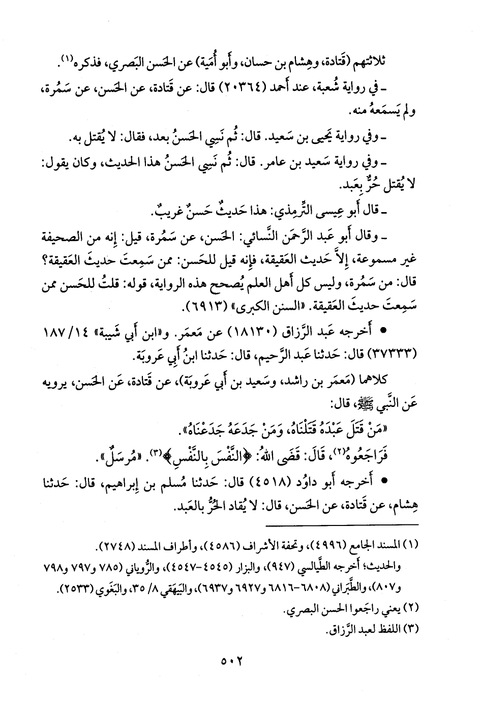 - وفي رواية سعيد بن عامر. قال: ثم نسي الحسن هذا الحديث، وكان يقول: لا يقتل حر بعبد.