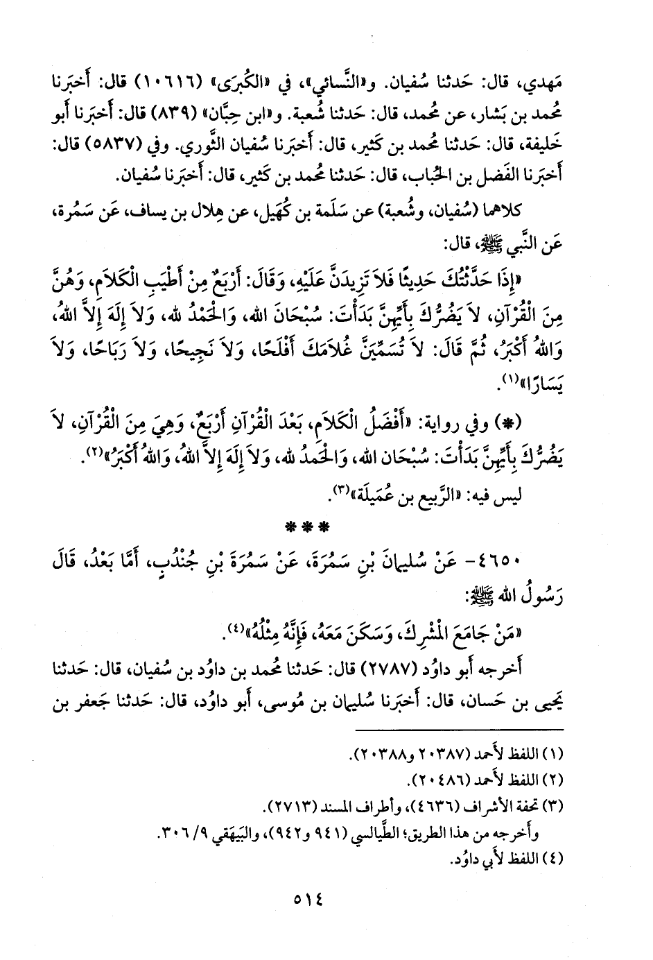 - وفي رواية: «أفضل الكلام، بعد القرآن أربع، وهي من القرآن، لا يضرك بأيهن بدأت: سبحان الله، والحمد لله، ولا إله إلا الله، والله أكبر» (¬٢).