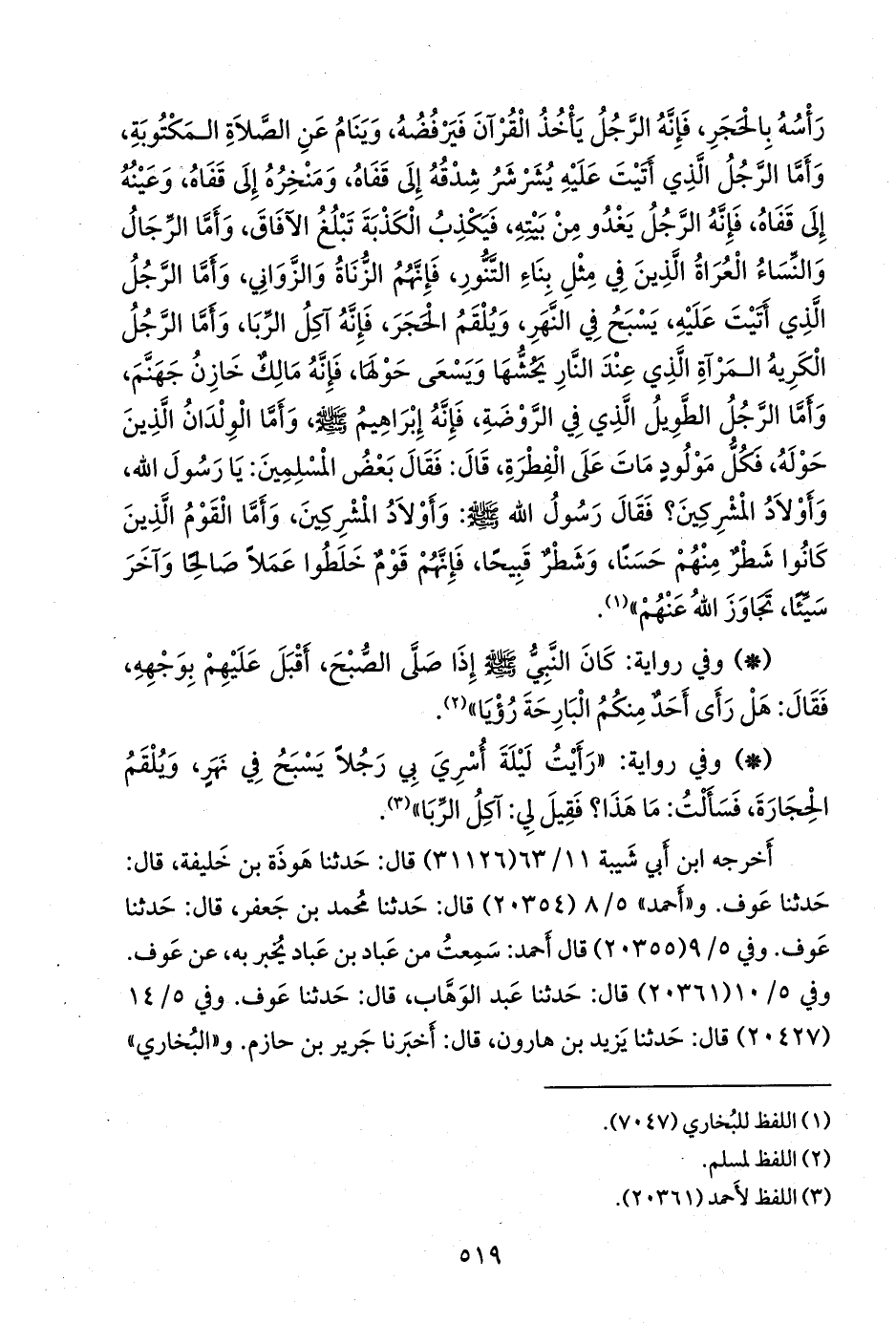 - وفي رواية: «رأيت ليلة أسري بي رجلا يسبح في نهر، ويلقم الحجارة، فسألت: ما هذا؟ فقيل لي: آكل الربا» (¬٣).