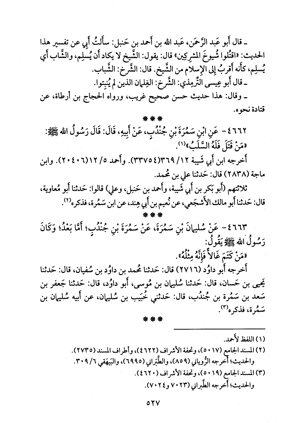 ثلاثتهم (أَبو بكر بن أبي شيبة، وأحمد بن حنبل، وعلي) عن أَبي معاوية الضرير محمد بن خازم، قال: حدثنا أَبو مالك الأشجعي، عن نعيم بن أبي هند، عن ابن سَمُرَة، فذكره (¬٢).