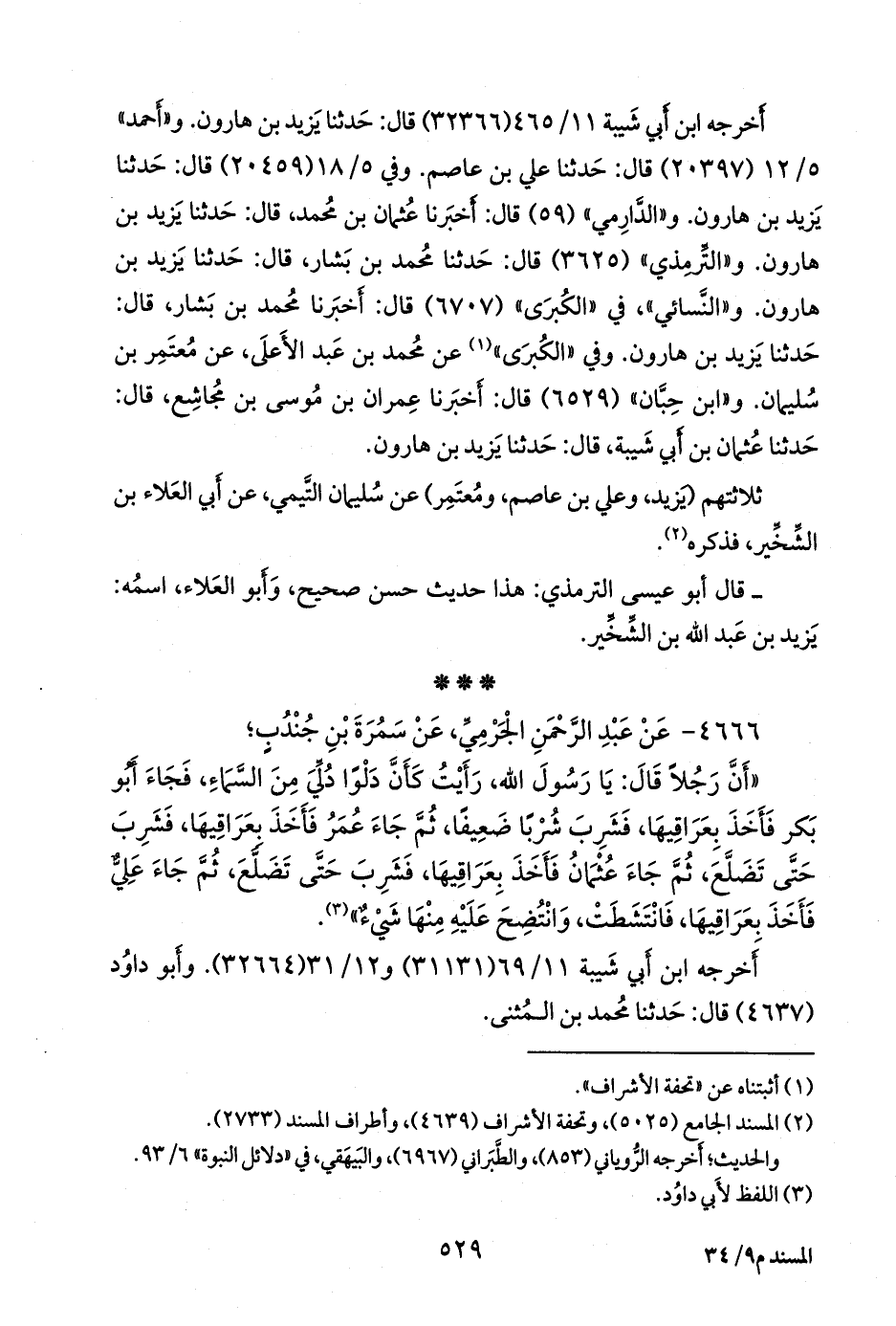 وفي ٥/ ١٨ (٢٠٤٥٩) قال: حدثنا يزيد بن هارون. و «الدَّارِمي» (٥٩) قال: أخبرنا عثمان بن محمد، قال: حدثنا يزيد بن هارون. و «التِّرمِذي» (٣٦٢٥) قال: حدثنا محمد بن بشار، قال: حدثنا يزيد بن هارون. و «النَّسَائي» في «الكبرى» (٦٧٠٧) قال: أخبرنا محمد بن بشار، قال: حدثنا يزيد بن هارون. وفي «الكبرى» (¬١) عن محمد بن عبد الأعلى، عن مُعتَمِر بن سليمان. و «ابن حِبَّان» (٦٥٢٩) قال: أخبرنا عمران بن موسى بن مجاشع، قال: حدثنا عثمان بن أبي شيبة، قال: حدثنا يزيد بن هارون.