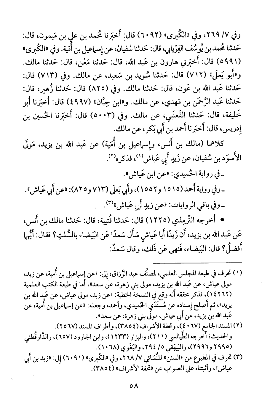 (¬٣) تصحف في المطبوع من «السنن» للنسائي ٧/ ٢٦٨، وفي «الكبرى» (٦٠٩١) إلى: «زيد بن أبي عياش»، وأثبتناه على الصواب عن «تحفة الأشراف» (٣٨٥٤).