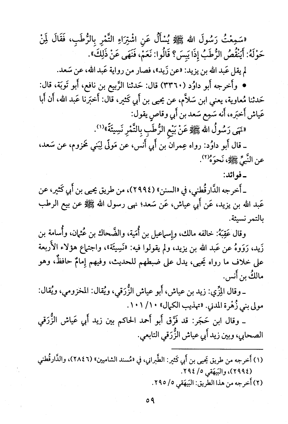 - أخرجه الدارقُطني في «السنن» (٢٩٩٤)، من طريق يحيى بن أبي كثير، عن عبد الله بن يزيد، عن أبي عياش، عن سعد؛ نهى رسول الله صَلى الله عَليه وسَلم عن بيع الرطب بالتمر نسيئة.