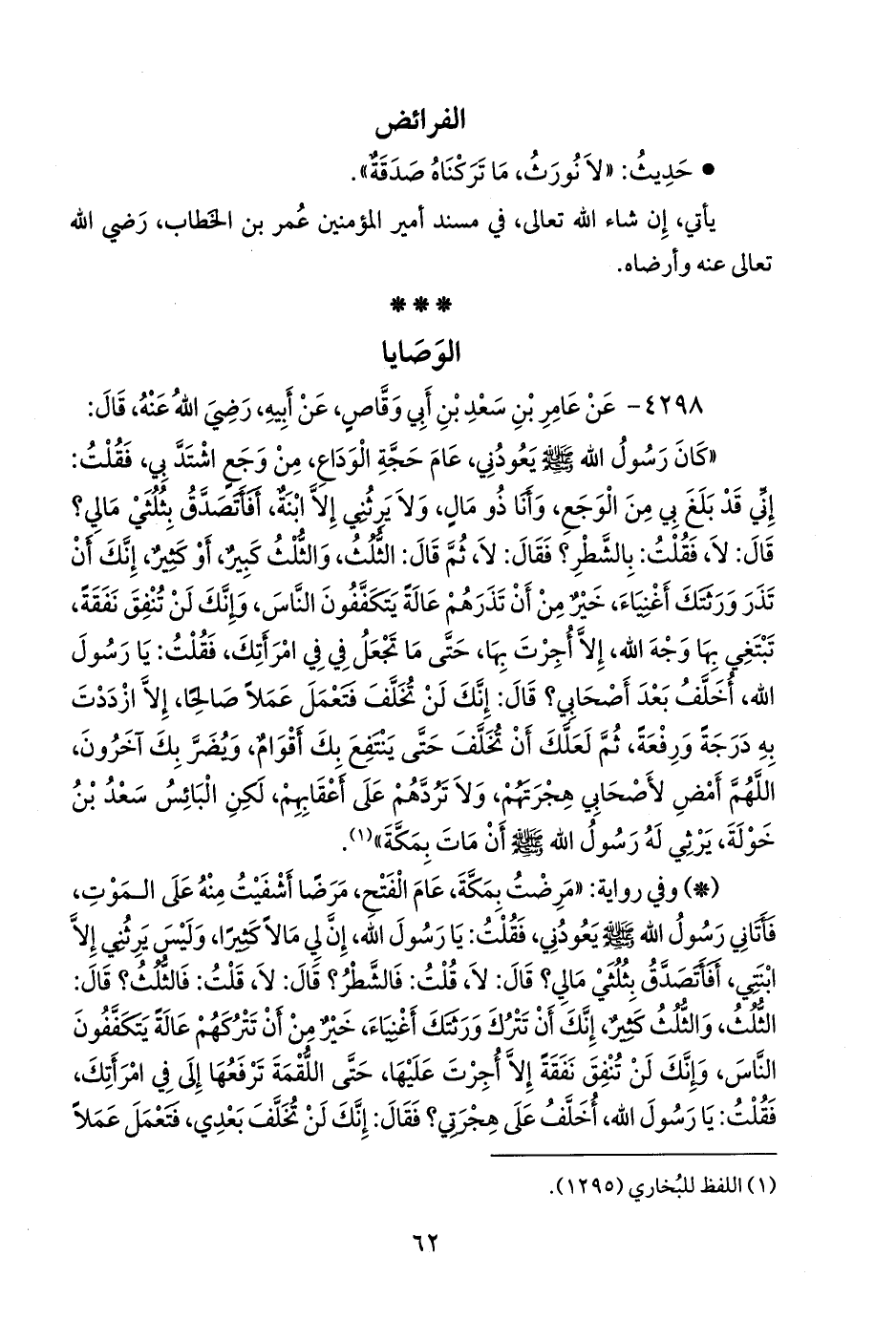 «كان رسول الله صَلى الله عَليه وسَلم يعودني، عام حجة الوداع، من وجع اشتد بي، فقلت: إني قد بلغ بي من الوجع، وأنا ذو مال، ولا يرثني إلا ابنة، أفأتصدق بثلثي مالي؟ قال: لا، فقلت: بالشطر؟ فقال: لا، ثم قال: الثلث، والثلث كبير، أو كثير، إنك أن تذر ورثتك أغنياء، خير من أن تذرهم عالة يتكففون الناس، وإنك لن تنفق نفقة، تبتغي بها وجه الله، إلا أجرت بها، حتى ما تجعل في في امرأتك، فقلت: يا رسول الله، أخلف بعد أصحابي؟ قال: إنك لن تخلف فتعمل عملا صالحا، إلا ازددت به درجة ورفعة، ثم لعلك أن تخلف حتى ينتفع بك أقوام، ويضر بك آخرون، اللهم أمض لأصحابي هجرتهم، ولا تردهم على أعقابهم، لكن البائس سعد بن خولة، يرثي له رسول الله صَلى الله عَليه وسَلم أن مات بمكة» (¬١).