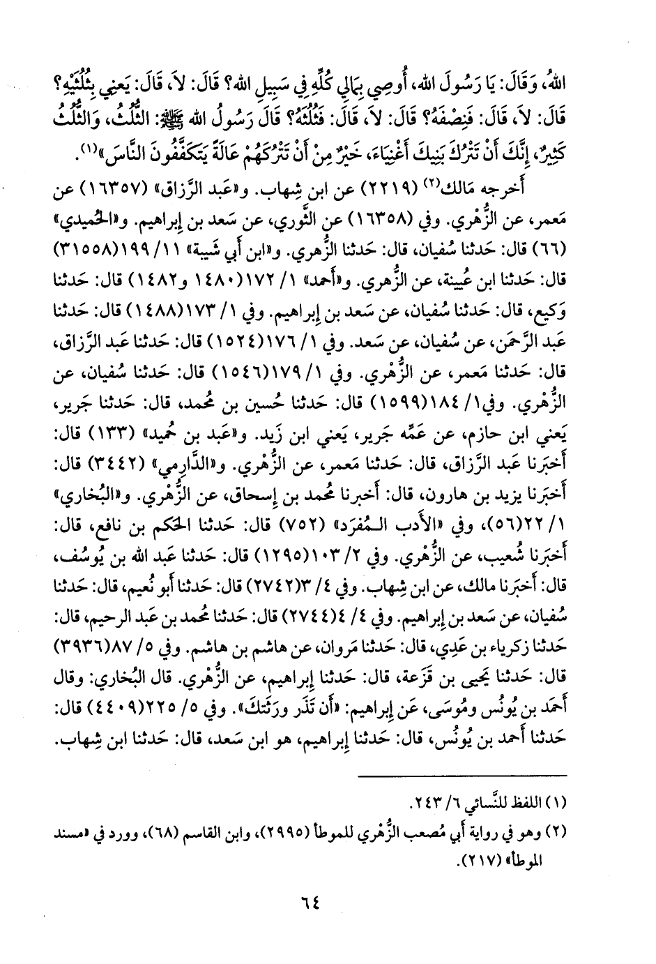 أخرجه مالك (¬١) (٢٢١٩) عن ابن شهاب. و «عبد الرزاق» (١٦٣٥٧) عن مَعمَر، عن الزُّهْري. وفي (١٦٣٥٨) عن الثوري، عن سعد بن إبراهيم. و «الحميدي» (٦٦) قال: حدثنا سفيان، قال: حدثنا الزُّهْري. و «ابن أبي شيبة» (٣١٥٥٨) قال: حدثنا ابن عُيينة، عن الزُّهْري. و «أحمد» (١٤٨٠ و ١٤٨٢) قال: حدثنا وكيع، قال: حدثنا سفيان، عن سعد بن إبراهيم. وفي ١/ ١٧٣ (١٤٨٨) قال: حدثنا عبد الرَّحمَن، عن سفيان، عن سعد. وفي ١/ ١٧٦ (١٥٢٤) قال: حدثنا عبد الرزاق، قال: حدثنا مَعمَر، عن الزُّهْري. وفي ١/ ١٧٩ (١٥٤٦) قال: حدثنا سفيان، عن الزُّهْري. وفي ١/ ١٨٤ (١٥٩٩) قال: حدثنا حسين بن محمد، قال: حدثنا جرير، يعني ابن حازم، عن عمه جرير، يعني ابن زيد. و «عَبد بن حُميد» (١٣٣) قال: أخبرنا عبد الرزاق، قال: حدثنا مَعمَر، عن الزُّهْري. و «الدَّارِمي» (٣٤٤٢) قال: أخبرنا يزيد بن هارون، قال: أخبرنا محمد بن إسحاق، عن الزُّهْري. و «البخاري» ١/ ٢٠ (٥٦)، وفي «الأدب المفرد» (٧٥٢) قال: حدثنا الحكم بن نافع, قال: أخبرنا شعيب، عن الزُّهْري. وفي ٢/ ٨١ (١٢٩٥) قال: حدثنا عبد الله بن يوسف، قال: أخبرنا مالك، عن ابن شهاب. وفي ٤/ ٣ (٢٧٤٢) قال: حدثنا أَبو نُعيم، قال: حدثنا سفيان، عن سعد بن إبراهيم. وفي ٤/ ٣ (٢٧٤٤) قال: حدثنا محمد بن عبد الرحيم، قال: حدثنا زكريا بن عَدي، قال: حدثنا مروان، عن هاشم بن هاشم. وفي ٥/ ٦٨ (٣٩٣٦) قال: حدثنا يحيى بن قَزَعة، قال: حدثنا إبراهيم، عن الزُّهْري. قال البخاري: وقال أحمد بن يونس وموسى، عن إبراهيم: «أن تذر ورثتك». وفي ٥/ ١٧٨ (٤٤٠٩) قال: حدثنا أحمد بن يونس، قال: حدثنا إبراهيم، هو ابن سعد، قال: حدثنا ابن شهاب.