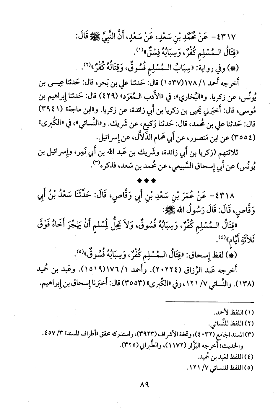 - لفظ إسحاق: «قتال المسلم كفر، وسبابه فسوق» (¬٢).