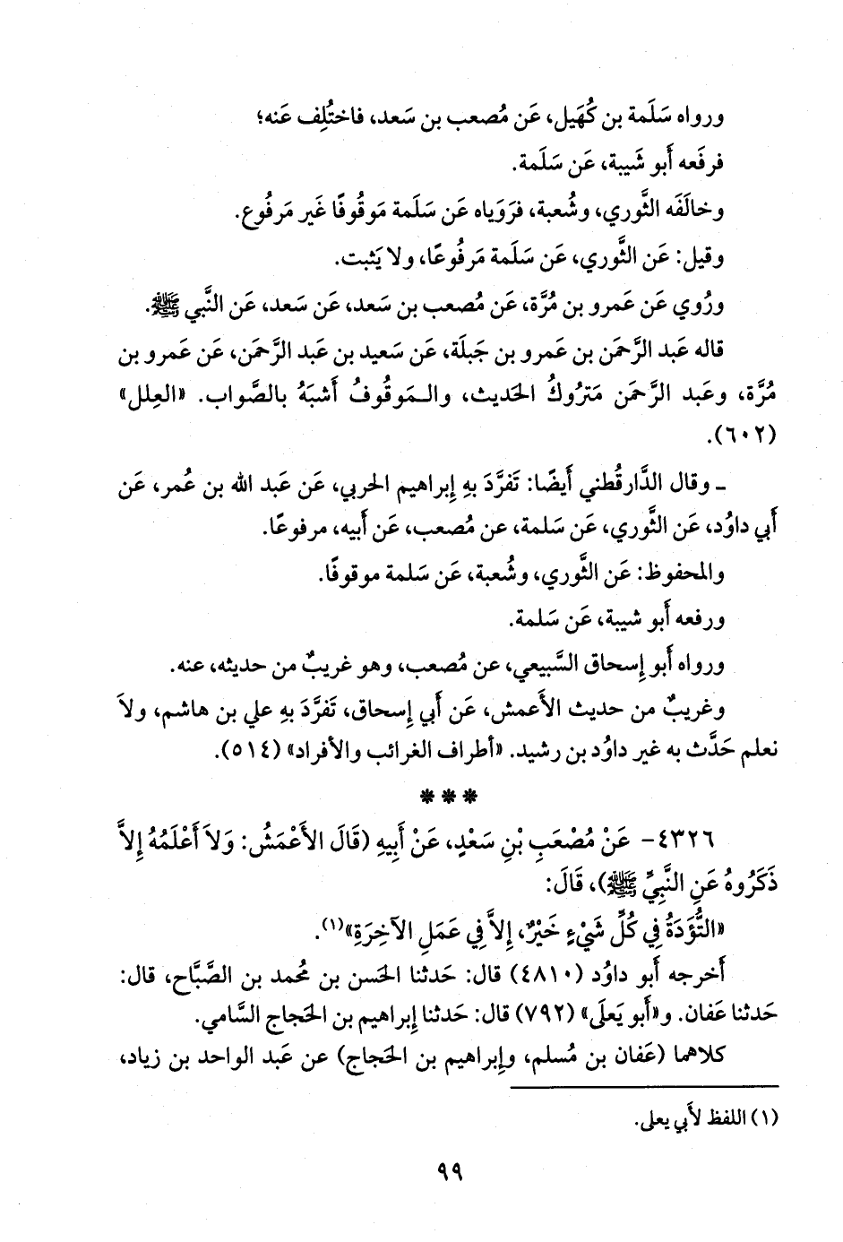 - في رواية أبي داود: «سليمان الأعمش, عن مالك بن الحارث, قال الأعمش: وقد سمعتُهم يذكرون عن مصعب بن سعد, عن أبيه, قال الأعمش: ولا أَعلمُه إلَّا عن النبي صَلى الله عَليه وسَلم»، ولم يرد فيها قوله: «خير».