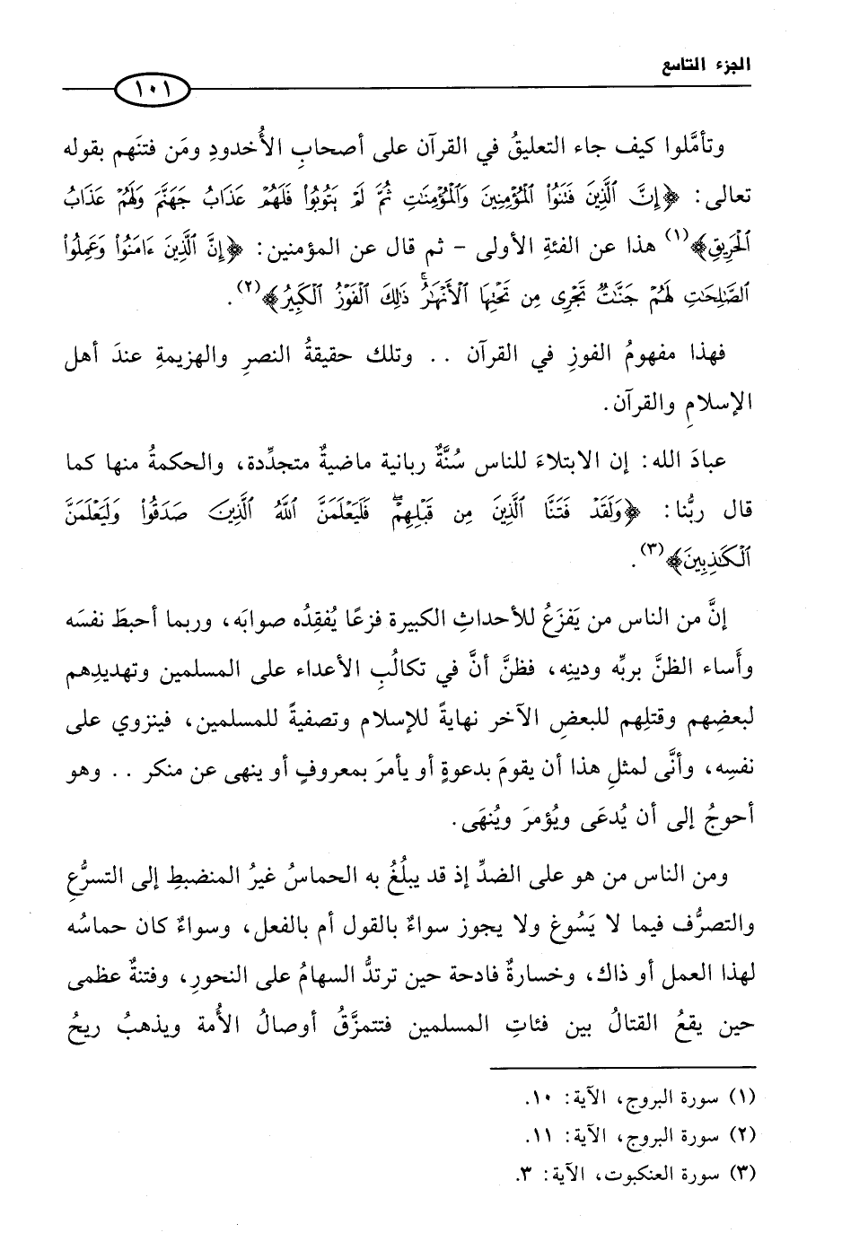 وتأمَّلوا كيف جاء التعليقُ في القرآن على أصحابِ الأُخدودِ ومَن فتنَهم بقوله تعالى: {إِنَّ الَّذِينَ فَتَنُوا الْمُؤْمِنِينَ وَالْمُؤْمِنَاتِ ثُمَّ لَمْ يَتُوبُوا فَلَهُمْ عَذَابُ جَهَنَّمَ وَلَهُمْ عَذَابُ الْحَرِيقِ} (¬1) هذا عن الفئةِ الأولى - ثم قال عن المؤمنين: {إِنَّ الَّذِينَ آمَنُوا وَعَمِلُوا الصَّالِحَاتِ لَهُمْ جَنَّاتٌ تَجْرِي مِنْ تَحْتِهَا الْأَنْهَارُ ذَلِكَ الْفَوْزُ الْكَبِيرُ} (¬2).