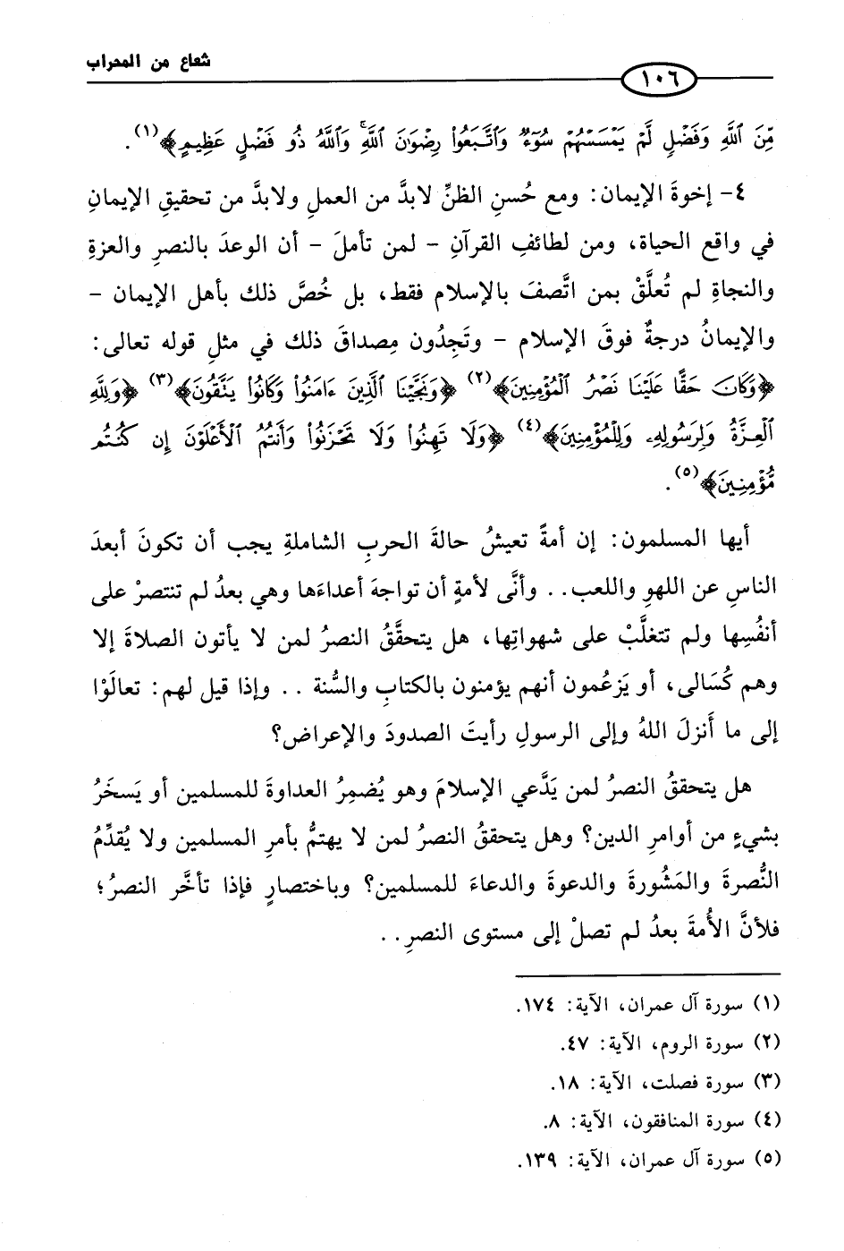 4 - إخوةَ الإيمان: ومع حُسنِ الظنِّ لابدَّ من العملِ ولابدَّ من تحقيقِ الإيمانِ في واقع الحياة، ومن لطائفِ القرآنِ - لمن تأملَ - أن الوعدَ بالنصرِ والعزةِ والنجاةِ لم تُعلَّقْ بمن اتَّصفَ بالإسلام فقط، بل خُصَّ ذلك بأهل الإيمان - والإيمانُ درجةٌ فوقَ الإسلام - وتَجِدُون مِصداقَ ذلك في مثلِ قوله تعالى: {وَكَانَ حَقًّا عَلَيْنَا نَصْرُ الْمُؤْمِنِينَ} (¬2) {وَنَجَّيْنَا الَّذِينَ آمَنُوا وَكَانُوا يَتَّقُونَ} (¬3) {وَلِلَّهِ الْعِزَّةُ وَلِرَسُولِهِ وَلِلْمُؤْمِنِينَ} (¬4) {وَلَا تَهِنُوا وَلَا تَحْزَنُوا وَأَنْتُمُ الْأَعْلَوْنَ إِنْ كُنْتُمْ مُؤْمِنِينَ} (¬5).
