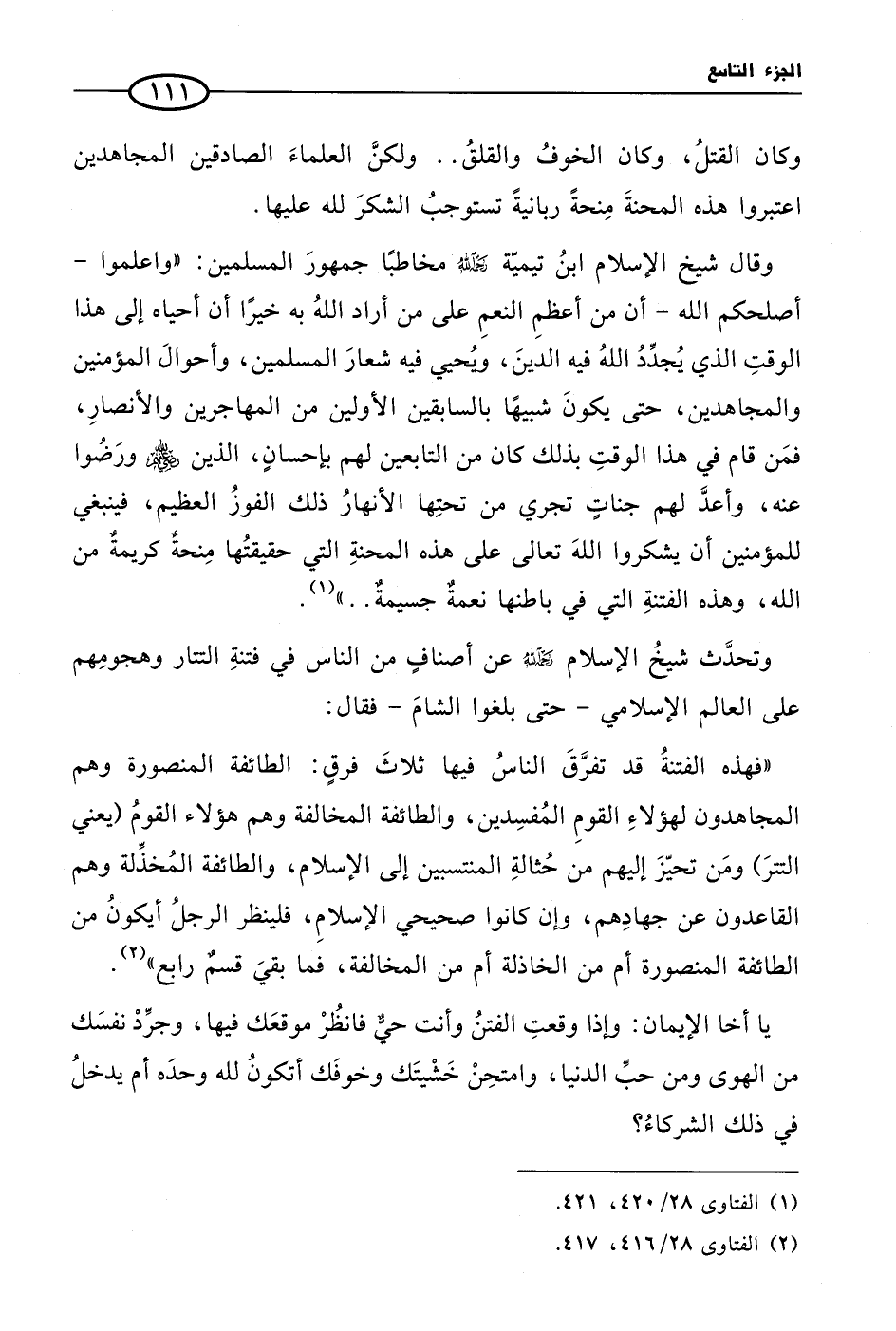 وتحدَّث شيخُ الإسلام - رحمه الله - عن أصنافٍ من الناس في فتنةِ التتار وهجومِهم على العالم الإسلامي - حتى بلغوا الشامَ - فقال: