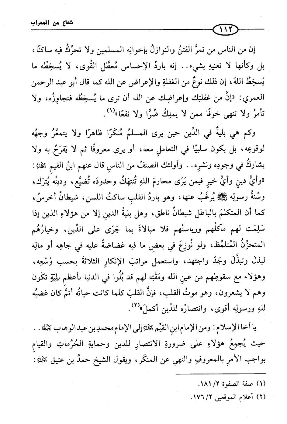 يا أخا الإسلام: ومن الإمام ابنِ القيِّم - رحمه الله - إلى الإمام محمدِ بن عبد الوهاب - رحمه الله - .. حيث يُجمِعُ هؤلاءِ على ضرورةِ الانتصارِ للدين وحمايةِ الحُرُماتِ والقيامِ بواجب الأمرِ بالمعروفِ والنهي عن المنكَر، ويقول الشيخ حمدُ بن عتيق - رحمه الله -: