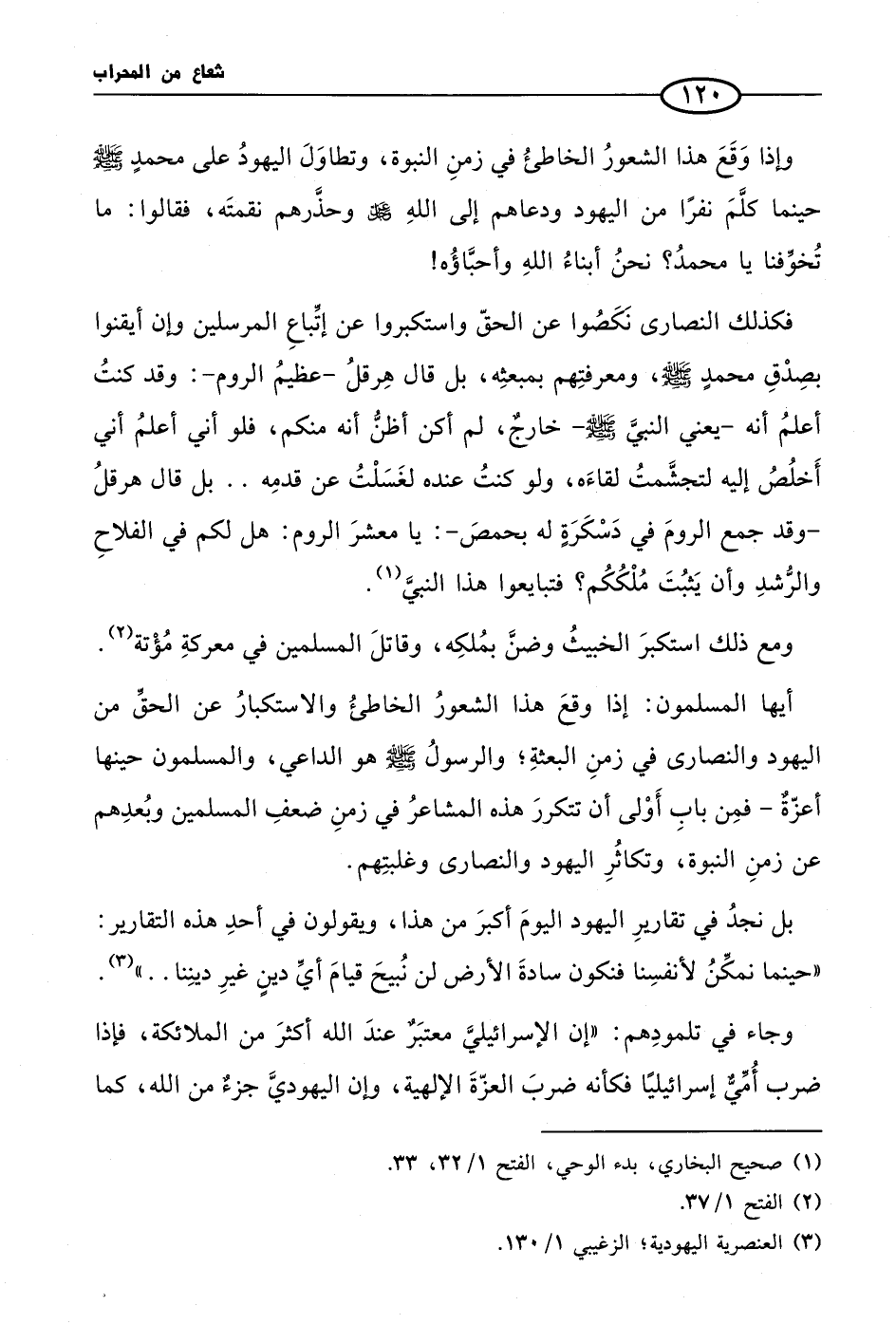 فكذلك النصارى نَكَصُوا عن الحقّ واستكبروا عن إتِّباعِ المرسلين وإن أيقنوا بصِدْقِ محمدٍ صلى الله عليه وسلم، ومعرفتِهم بمبعثِه، بل قال هِرقلُ - عظيمُ الروم -: وقد كنتُ أعلمُ أنه - يعني النبيَّ صلى الله عليه وسلم - خارجٌ، لم أكن أظنُّ أنه منكم، فلو أني أعلمُ أني أَخلُصُ إليه لتجشَّمتُ لقاءَه، ولو كنتُ عنده لغَسَلْتُ عن قدمِه .. بل قال هرقلُ - وقد جمع الرومَ في دَسْكَرَةٍ له بحمصَ -: يا معشرَ الروم: هل لكم في الفلاحِ والرُّشدِ وأن يَثبُتَ مُلْكُكُم؟ فتبايعوا هذا النبيَّ (¬1).