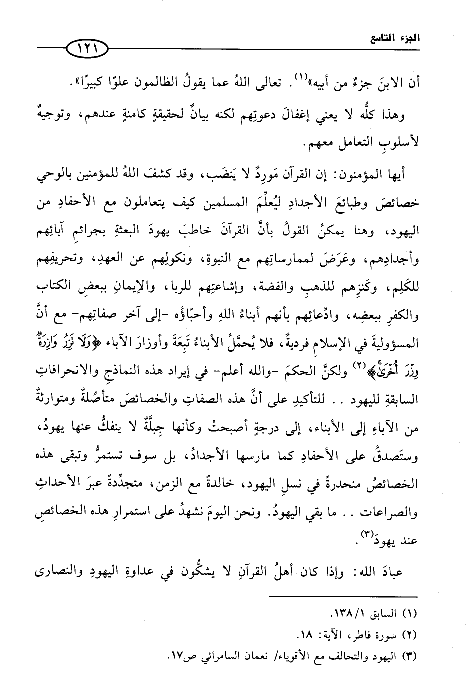 أيها المؤمنون: إن القرآن مَورِدٌ لا يَنضَب، وقد كشفَ اللهُ للمؤمنين بالوحي خصائصَ وطبائعَ الأجدادِ ليُعلِّمَ المسلمين كيف يتعاملون مع الأحفادِ من اليهود، وهنا يمكنُ القولُ بأنَّ القرآنَ خاطبَ يهودَ البعثةِ بجرائمِ آبائِهم وأجدادِهم، وعَرَضَ لممارساتِهم مع النبوةِ، ونكولِهم عن العهدِ، وتحريفِهم للكَلِم، وكَنزِهم للذهبِ والفضة، وإشاعتِهم للربا، والإيمانِ ببعضِ الكتاب والكفرِ ببعضِه، وادِّعائِهم بأنهم أبناءُ اللهِ وأحبّاؤُه - إلى آخر صفاتِهم - مع أنَّ المسؤوليةَ في الإسلامِ فرديةٌ، فلا يُحمَّلُ الأبناءُ تَبِعَةَ وأوزارَ الآباء {وَلَا تَزِرُ وَازِرَةٌ وِزْرَ أُخْرَى} (¬2) ولكنَّ الحكمَ - والله أعلم - في إيراد هذه النماذجِ والانحرافاتِ السابقةِ لليهود .. للتأكيدِ على أنَّ هذه الصفاتِ والخصائصَ متأصِّلةٌ ومتوارثةٌ من الآباءِ إلى الأبناء، إلى درجةٍ أصبحتْ وكأنها جِبلَّةٌ لا ينفكُّ عنها يهودُ، وستَصدقُ على الأحفادِ كما مارسها الأجدادُ، بل سوف تستمرُّ وتبقى هذه الخصائصُ منحدرةً في نسلِ اليهود، خالدةً مع الزمن، متجدِّدةً عبرَ الأحداثِ والصراعات .. ما بقي اليهودُ. ونحن اليومَ نشهدُ على استمرارِ هذه الخصائصِ عند يهودَ (¬3).