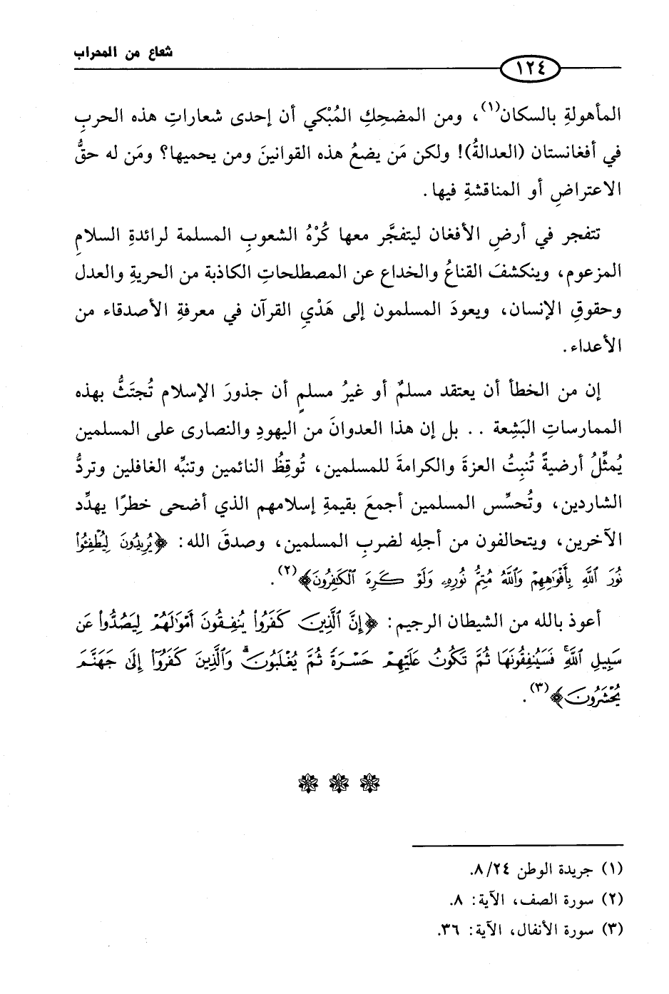 تتفجر في أرضِ الأفغان ليتفجَّر معها كُرْهُ الشعوبِ المسلمة لرائدةِ السلامِ المزعوم، وينكشفَ القناعُ والخداع عن المصطلحاتِ الكاذبة من الحريةِ والعدل وحقوقِ الإنسان، ويعودَ المسلمون إلى هَدْيِ القرآن في معرفةِ الأصدقاء من الأعداء.