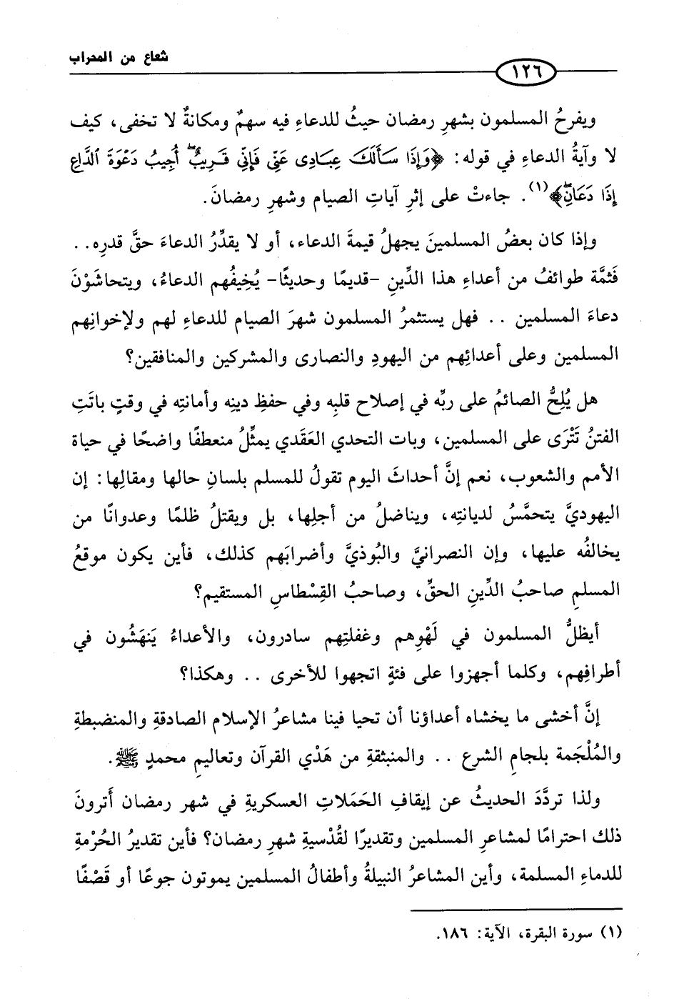 ولذا تردَّدَ الحديثُ عن إيقافِ الحَمَلاتِ العسكريةِ في شهر رمضان أَترونَ ذلك احترامًا لمشاعرِ المسلمين وتقديرًا لقُدْسيةِ شهرِ رمضان؟ فأين تقديرُ الحُرْمةِ للدماءِ المسلمة، وأين المشاعرُ النبيلةُ وأطفالُ المسلمين يموتون جوعًا أو قَصْفًا