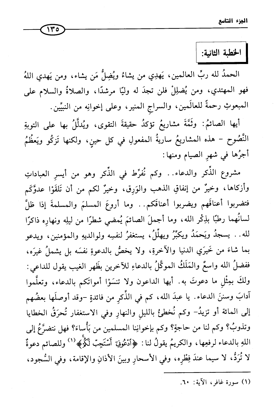 مشروع الذِّكر والدعاء .. وكم نُفرِّط في الذِّكر وهو من أيسرِ العباداتِ وأزكاها، وخيرٌ من إنفاقِ الذهب والوَرِق، وخيرٌ لكم من أن تَلقَوْا عدوَّكَم فتضربوا أعناقَهم ويضربوا أعناقَكم .. وما أروعَ المسلمَ والمسلمةَ إذا ظلَّ لسانُهما رطبًا بذِكْر الله، وما أجملَ الصائمَ يُمضي شطرًا من ليلِه ونهارِه ذاكرًا لله .. يسجدُ ويَحمَدُ ويكبِّرُ ويهلِّلُ، يستغفرُ لنفسِه ولوالديهِ والمؤمنين، ويدعو بما شاءَ من خَيرَي الدنيا والآخرةِ، ولا يخصُّ بالدعوةِ نفسَه بل يشملُ غيرَه، ففضلُ الله واسعٌ والمَلَكُ الموكَّلُ بالدعاءِ للآخرين بظَهر الغيب يقول للداعي: ولكَ بمِثْلِ ما دعوتَ به. أيها الداعون ولا تنسَوْا أمواتَكم بالدعاء، وتعلَّموا آدابَ وسننَ الدعاء. يا عبدَ الله، كم في الذِّكرِ من فائدةٍ - وقد أوصلَها بعضُهم إلى المائة أو تزيدُ - وكم نُخطئُ بالليلِ والنهارِ وفي الاستغفار تُحرَقُ الخطايا وتذوبُ؟ وكم لنا من حاجةٍ؟ وكم بإخوانِنا المسلمين من بَأْساءَ؟ فهل نتضرَّعُ إلى اللهِ بالدعاء لرفعِها، والكريمُ يقولُ لنا: {ادْعُونِي أَسْتَجِبْ لَكُمْ} (¬1) وللصائم دعوةٌ لا تُرَدُّ، لا سيما عندَ فِطْرِه، وفي الأسحارِ وبينَ الأذانِ والإقامة، وفي السُّجود،