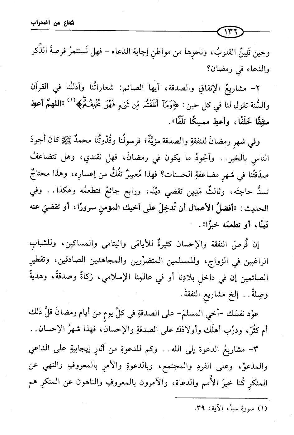 إن فُرصَ النفقة والإحسان كثيرةٌ للأيامَى واليتامى والمساكين، وللشبابِ الراغبين في الزواج، وللمسلمين المتضرِّرين والمجاهدين الصادقين، وتفطيرِ الصائمين إن في داخلِ بلادِنا أو في عالمِنا الإسلامي، زكاةً وصدقةً، وهديةً وصِلةً .. إلخ مشاريعِ النفقةَ.