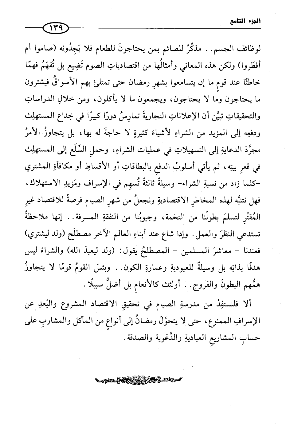 لوظائف الجسم .. مذكِّرٌ للصائم بمن يحتاجونَ للطعام فلا يَجِدُونه (صاموا أم أفطَروا) ولكن هذه المعاني وأمثالُها من اقتصادياتِ الصوم تَضِيع بل تُفهَمُ فهمًا خاطئًا عند قومٍ ما إن يتسامعوا بشهرِ رمضان حتى تمتلئَ بهم الأسواقُ فيشترون ما يحتاجون وما لا يحتاجون، ويجمعون ما لا يأكلون، ومن خلالِ الدراساتِ والتحقيقاتِ تبيَّن أن الإعلاناتِ التجاريةَ تمارِسُ دورًا كبيرًا في خِداع المستهلِك ودفعِه إلى المزيد من الشراءِ لأشياءَ كثيرةٍ لا حاجةَ له بها، بل يتجاوزُ الأمرُ مجرَّدَ الدعايةِ إلى التسهيلاتِ في عمليات الشراءِ، وحملِ السِّلَع إلى المستهلِك في قعرِ بيتِه، ثم يأتي أسلوبُ الدفعِ بالبطاقاتِ أو الأقساطِ أو مكافأةِ المشتري - كلما زاد من نسبةِ الشراء - وسيلةً ثالثةً تُسهِم في الإسراف ومَزيدِ الاستهلاك، فهل نتنبَّه لهذه المخاطرِ الاقتصاديةِ ونجعلُ من شهرِ الصيام فرصةً للاقتصاد غيرِ المُقتِّرِ لتسلمَ بطونُنا من التخمة، وجيوبُنا من النفقةِ المسرفة .. إنها ملاحظةٌ تستدعي النظرَ والعمل. وإذا شاع عند أبناءِ العالم الآخر مصطلَح (ولد ليشتري) فعندنا - معاشرَ المسلمين - المصطلحُ يقول: (ولد ليعبدَ الله) والشراءُ ليس هدفًا بذاتِه بل وسيلةً للعبوديةِ وعمارةِ الكون .. وبئسَ القومُ قومًا لا يتجاوزُ همُّهم البطونَ والفروج .. أولئك كالأنعامِ بل أضلُّ سبيلًا.