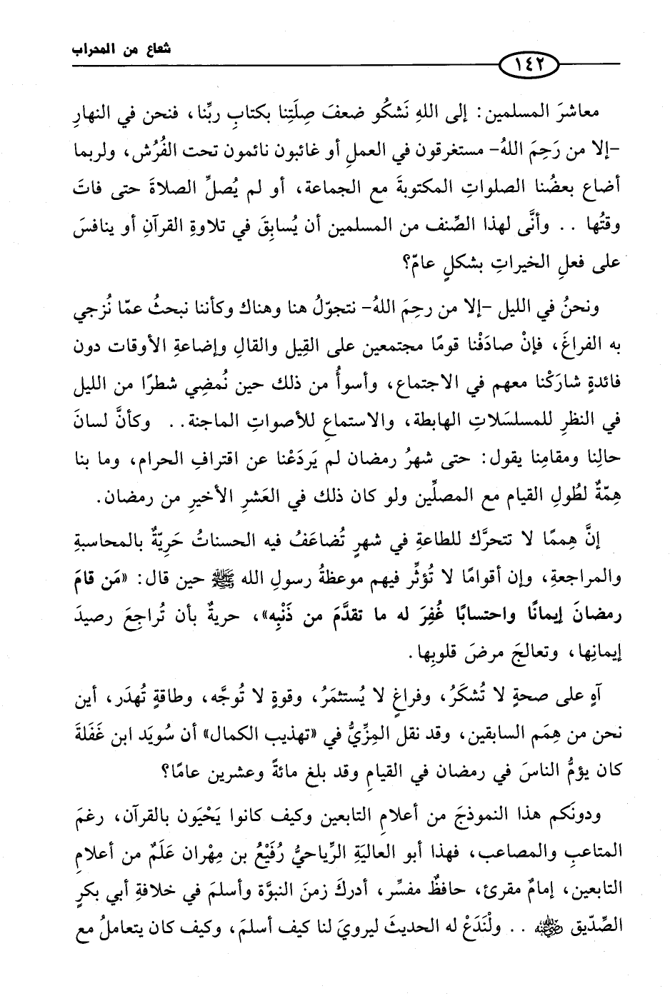 آهٍ على صحةٍ لا تُشكَرُ، وفراغٍ لا يُستثمَرُ، وقوةٍ لا تُوجَّه، وطاقةٍ تُهدَر، أين نحن من هِمَم السابقين، وقد نقل المِزِّيُّ في ((تهذيب الكمال)) أن سُويَد ابن غَفَلةَ كان يؤمُّ الناسَ في رمضان في القيامِ وقد بلغ مائةً وعشرين عامًا؟