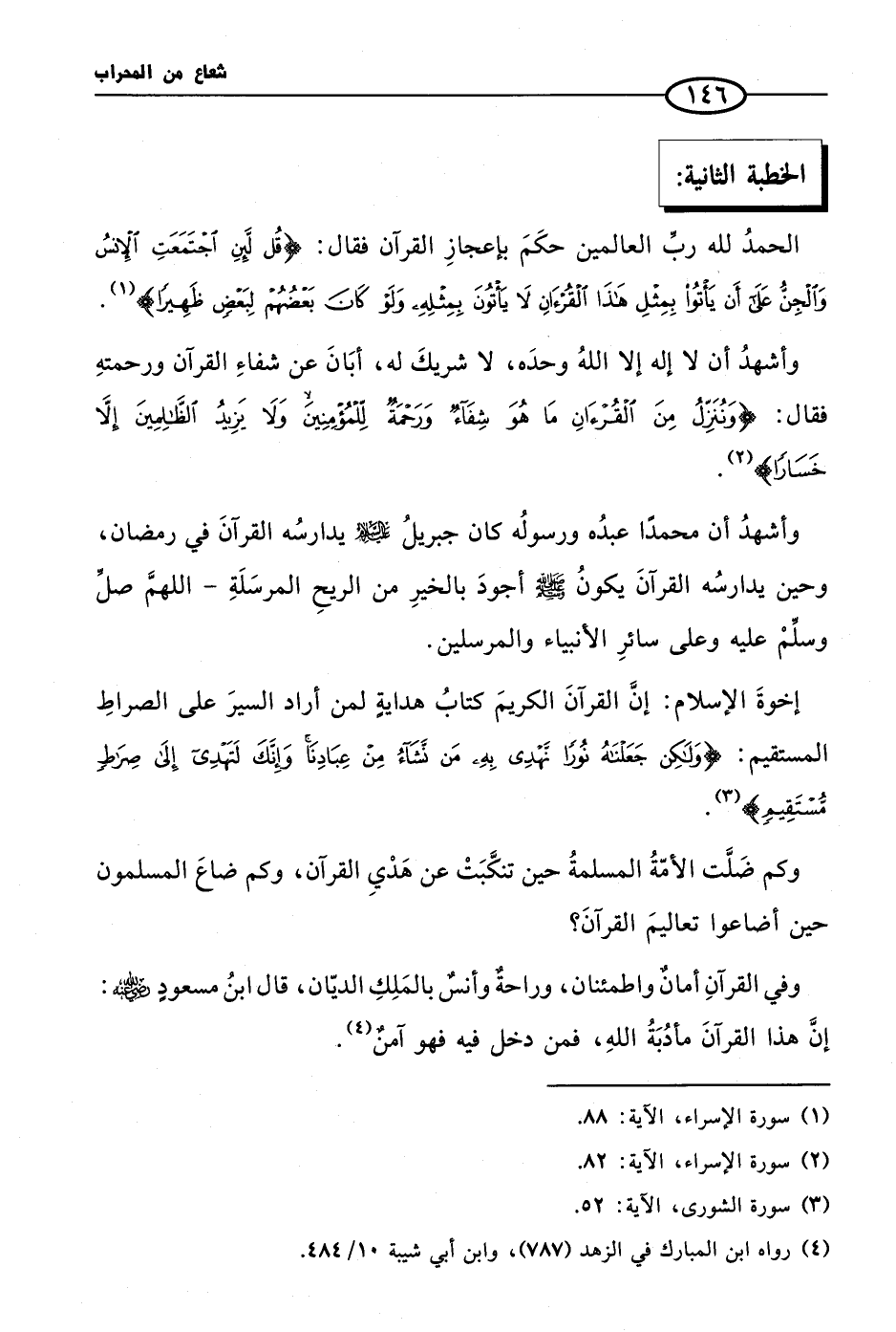 وأشهدُ أن لا إله إلا اللهُ وحدَه، لا شريكَ له، أبَانَ عن شفاءِ القرآن ورحمتهِ فقال: {وَنُنَزِّلُ مِنَ الْقُرْآنِ مَا هُوَ شِفَاءٌ وَرَحْمَةٌ لِلْمُؤْمِنِينَ وَلَا يَزِيدُ الظَّالِمِينَ إِلَّا خَسَارًا} (¬2).