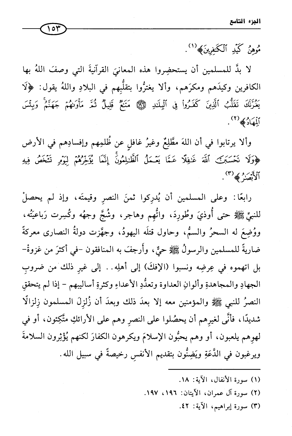 لا بدَّ للمسلمين أن يستحضِروا هذه المعانيَ القرآنيةَ التي وصفَ اللهُ بها الكافرين وكيدَهم ومكرَهم، وألا يغترُّوا بتقلُّبِهم في البلادِ واللهُ يقول: {لَا يَغُرَّنَّكَ تَقَلُّبُ الَّذِينَ كَفَرُوا فِي الْبِلَادِ (196) مَتَاعٌ قَلِيلٌ ثُمَّ مَأْوَاهُمْ جَهَنَّمُ وَبِئْسَ الْمِهَادُ} (¬2).