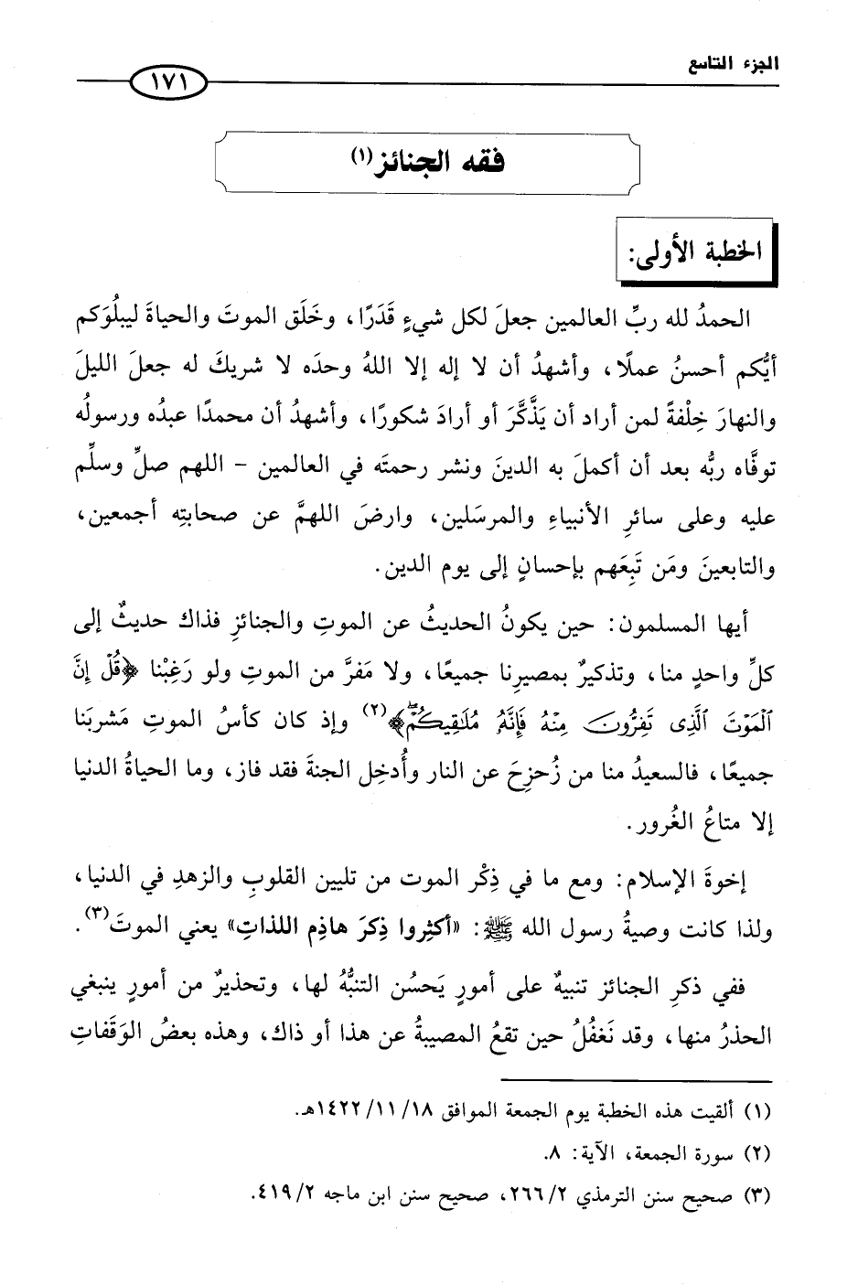 ففي ذكرِ الجنائز تنبيهٌ على أمورٍ يَحسُن التنبُّهُ لها، وتحذيرٌ من أمورٍ ينبغي الحذرُ منها، وقد نَغفُلُ حين تقعُ المصيبةُ عن هذا أو ذاك، وهذه بعضُ الوَقَفاتِ