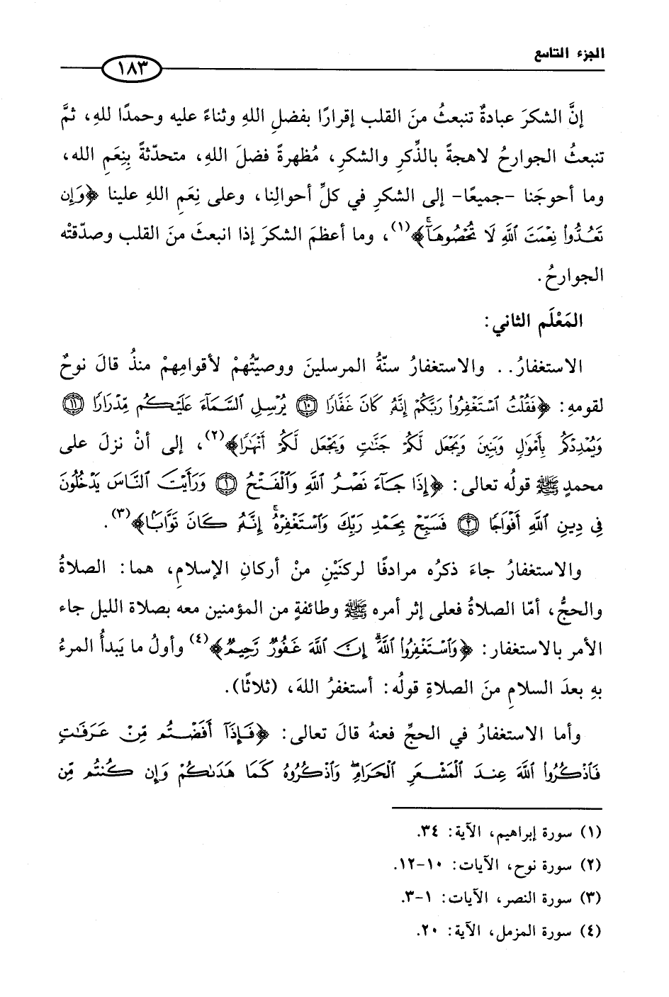 الاستغفارُ .. والاستغفارُ سنّةُ المرسلينَ ووصيّتُهمْ لأقوامِهمْ منذُ قالَ نوحٌ لقومهِ: {فَقُلْتُ اسْتَغْفِرُوا رَبَّكُمْ إِنَّهُ كَانَ غَفَّارًا (10) يُرْسِلِ السَّمَاءَ عَلَيْكُمْ مِدْرَارًا (11) وَيُمْدِدْكُمْ بِأَمْوَالٍ وَبَنِينَ وَيَجْعَلْ لَكُمْ جَنَّاتٍ وَيَجْعَلْ لَكُمْ أَنْهَارًا} (¬2)، إلى أنْ نزلَ على محمدٍ صلى الله عليه وسلم قولُه تعالى: {إِذَا جَاءَ نَصْرُ اللَّهِ وَالْفَتْحُ (1) وَرَأَيْتَ النَّاسَ يَدْخُلُونَ فِي دِينِ الله أَفْوَاجًا (2) فَسَبِّحْ بِحَمْدِ رَبِّكَ وَاسْتَغْفِرْهُ إِنَّهُ كَانَ تَوَّابًا} (¬3).