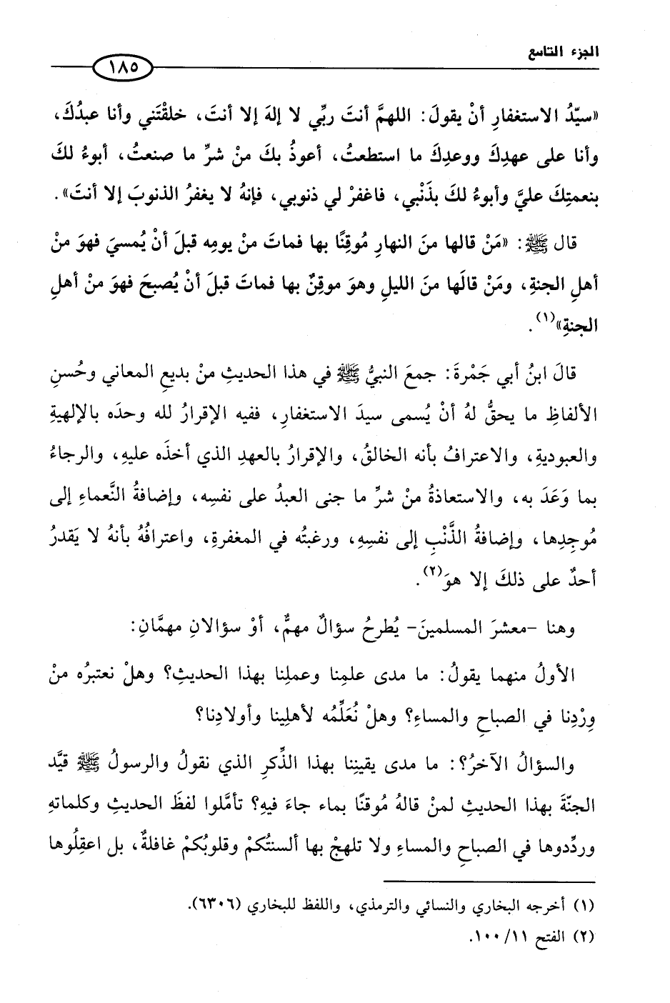 ((سيّدُ الاستغفارِ أنْ يقولَ: اللهمَّ أنتَ ربِّي لا إلهَ إلا أنتَ، خلقْتَني وأنا عبدُكَ، وأنا على عهدِكَ ووعدِكَ ما استطعتُ، أعوذُ بكَ منْ شرِّ ما صنعتُ، أبوءُ لكَ بنعمتِكَ عليَّ وأبوءُ لكَ بذَنْبي، فاغفرْ لي ذنوبي، فإنهُ لا يغفرُ الذنوبَ إلا أنتَ)).