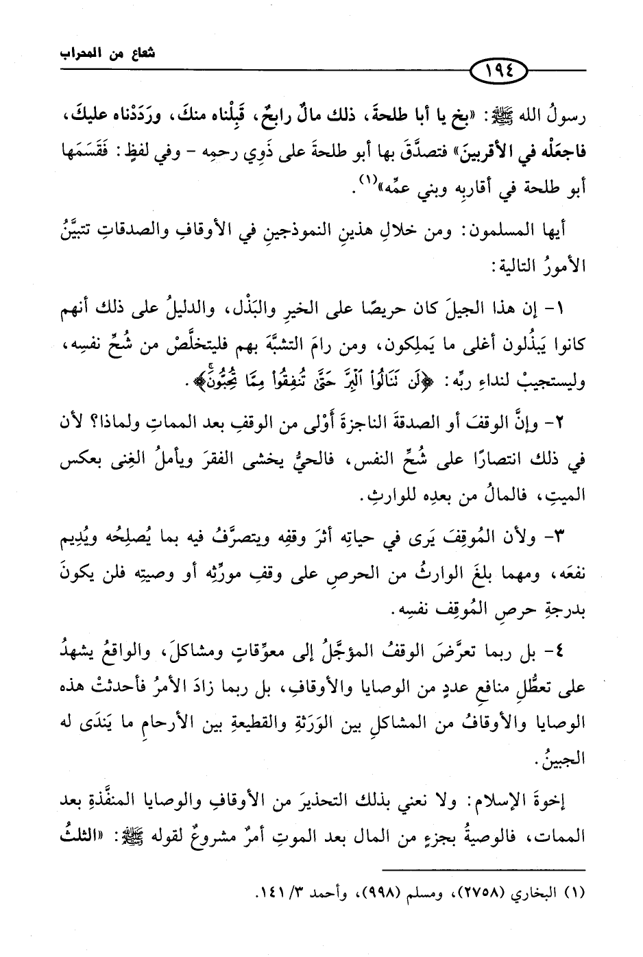 أيها المسلمون: ومن خلالِ هذينِ النموذجينِ في الأوقافِ والصدقاتِ تتبيَّنُ الأمورُ التالية: