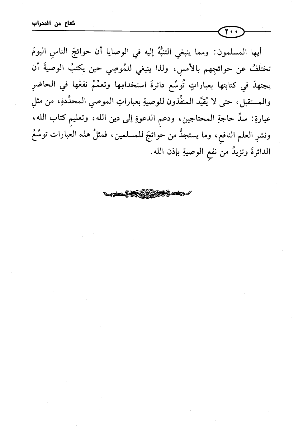 أيها المسلمون: ومما ينبغي التنبُّهُ إليه في الوصايا أن حوائجَ الناسِ اليومَ تختلفُ عن حوائجِهم بالأمسِ، ولذا ينبغي للمُوصِي حين يكتبُ الوصيةَ أن يجتهدَ في كتابتها بعباراتٍ تُوسِّع دائرةَ استخدامِها وتعمِّمُ نفعَها في الحاضرِ والمستقبل، حتى لا يُقيَّد المنفِّذون للوصيةِ بعباراتِ الموصي المحدَّدةِ، من مثلِ عبارةِ: سدِّ حاجةِ المحتاجين، ودعمِ الدعوةِ إلى دين الله، وتعليمِ كتاب الله، ونشرِ العلم النافعِ، وما يستجدُّ من حوائجَ للمسلمين، فمثلُ هذه العبارات توسِّعُ الدائرةَ وتزيدُ من نفعِ الوصيةِ بإذن الله.