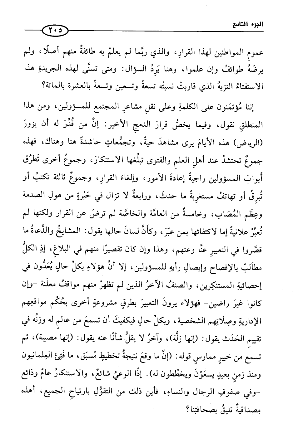 إننا مُؤتمَنون على الكلمةِ وعلى نقلِ مشاعرِ المجتمع للمسؤولين، ومن هذا المنطلقِ نقول، وفيما يخصُّ قرارَ الدمجِ الأخير: إنَّ من قُدِّرَ له أن يزورَ (الرياض) هذه الأيامَ يرى مشاهدَ حيةً، وتجمُّعاتٍ حاشدةً هنا وهناك، فهذه جموعٌ تحتشدُ عند أهلِ العلمِ والفتوى تبلِّغها الاستنكارَ، وجموعٌ أخرى تَطرُق أَبوابَ المسؤولين راجيةً إعادةَ الأمور، وإلغاءَ القرارِ، وجموعٌ ثالثة تكتبُ أو تُبرِقُ أو تهاتفُ مستغرِبةً ما حدثَ، ورابعةٌ لا تزال في حَيْرةٍ من هولِ الصدمة وعِظَم المُصَاب، وخامسةٌ من العامَّة والخاصَّة لم ترضَ عن القرار ولكنها لم تُعبِّرْ علانيةً إما لاكتفائها بمن عبّرَ، وكأَنَّ لسانَ حالها يقول: المشايخُ والدُّعاةُ ما قصَّروا في التعبيرِ عنَّا وعنهم، وهذا وإن كان تقصيرًا منهم في البلاغِ، إذِ الكلُّ مطاَلبٌ بالإفصاح وإيصالِ رأيهِ للمسؤولين، إلا أنَّ هؤلاءِ بكلِّ حالٍ يُعَدُّون في إحصائيةِ المستنكِرين، والصنفُ الآخرُ الذين لم تظهرْ منهم مواقفُ معلَنة -وإن كانوا غيرَ راضين- فهؤلاء يرونَ التعبيرَ بطرقٍ مشروعةٍ أخرى بحُكْم مواقعِهم الإداريةِ وصِلَاتِهم الشخصية، وبكلِّ حالٍ فيكفيكَ أن تسمعَ من عالمٍ له وزنُه في تقييمِ الحَدَث يقول: (إنها زلَّة)، وآخرُ لا يقلُّ شأنًا عنه يقول: (إنها مصيبة)، ثم تسمع من خبيرٍ ممارسٍ قوله: (إنَّ ما وقعَ نتيجةُ تخطيطٍ مُسبَق، ما فَتِئَ العِلمانيون ومنذ زمنٍ بعيدٍ يسعَوْنَ ويخطِّطون له). إذًا الوعيُ شائعٌ، والاستنكارُ عامٌ وذائع -وفي صفوفِ الرجال والنساءِ، فأين ذلك من التقوُّلِ بارتياحِ الجميع، أهذه مِصداقيةٌ تليقُ بصحافتِنا؟