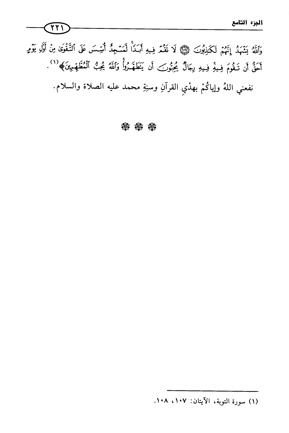وَاللَّهُ يَشْهَدُ إِنَّهُمْ لَكَاذِبُونَ (107) لاَ تَقُمْ فِيهِ أَبَدًا لَّمَسْجِدٌ أُسِّسَ عَلَى التَّقْوَى مِنْ أَوَّلِ يَوْمٍ أَحَقُّ أَن تَقُومَ فِيهِ فِيهِ رِجَالٌ يُحِبُّونَ أَن يَتَطَهَّرُوا وَاللَّهُ يُحِبُّ الْمُطَّهِّرِينَ} (¬1).