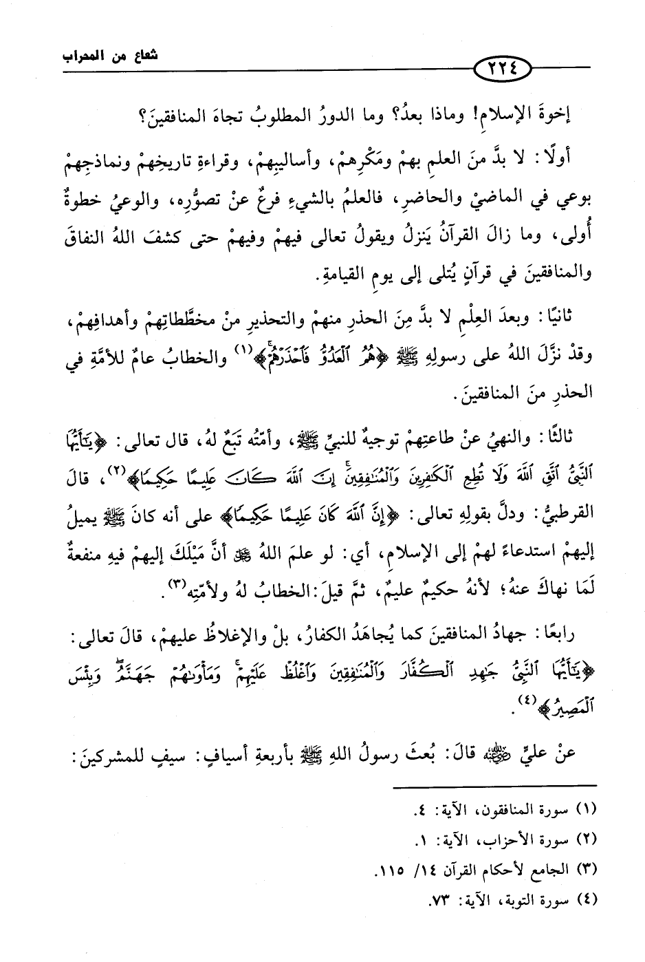 رابعًا: جهادُ المنافقينَ كما يُجاهَدُ الكفارُ، بلْ والإغلاظُ عليهمْ، قالَ تعالى: {يَا أَيُّهَا النَّبِيُّ جَاهِدِ الْكُفَّارَ وَالْمُنَافِقِينَ وَاغْلُظْ عَلَيْهِمْ وَمَأْوَاهُمْ جَهَنَّمُ وَبِئْسَ الْمَصِيرُ} (¬4).