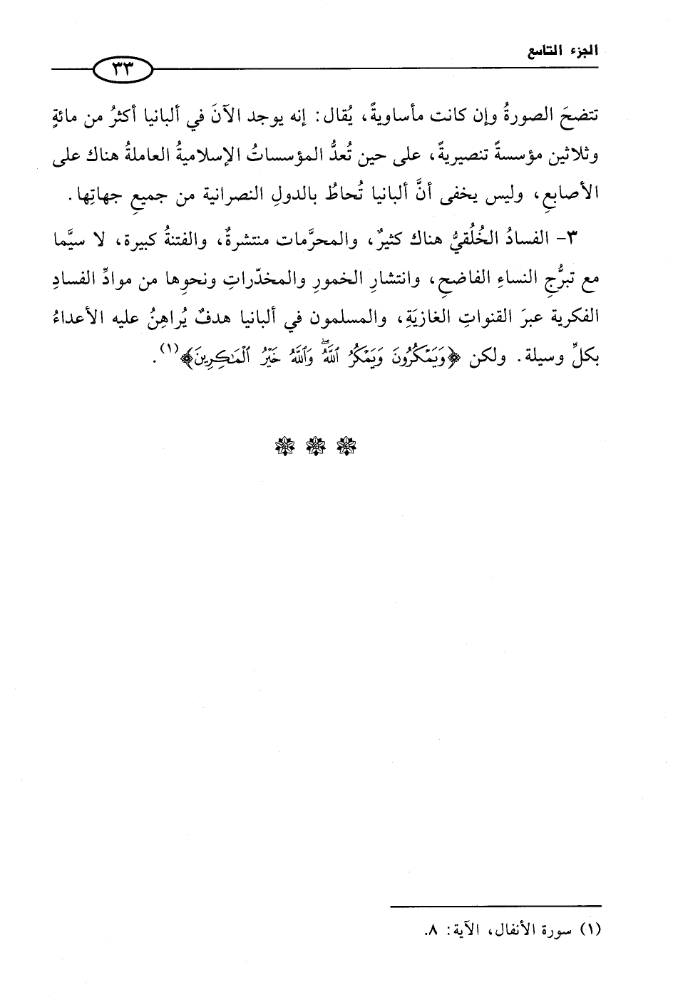 تتضحَ الصورةُ وإن كانت مأساويةً، يُقال: إنه يوجد الآنَ في ألبانيا أكثرُ من مائةٍ وثلاثين مؤسسةً تنصيريةً، على حين تُعدُّ المؤسساتُ الإسلاميةُ العاملةُ هناك على الأصابعِ، وليس يخفى أنَّ ألبانيا تُحاطُ بالدولِ النصرانية من جميعِ جهاتِها.